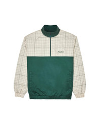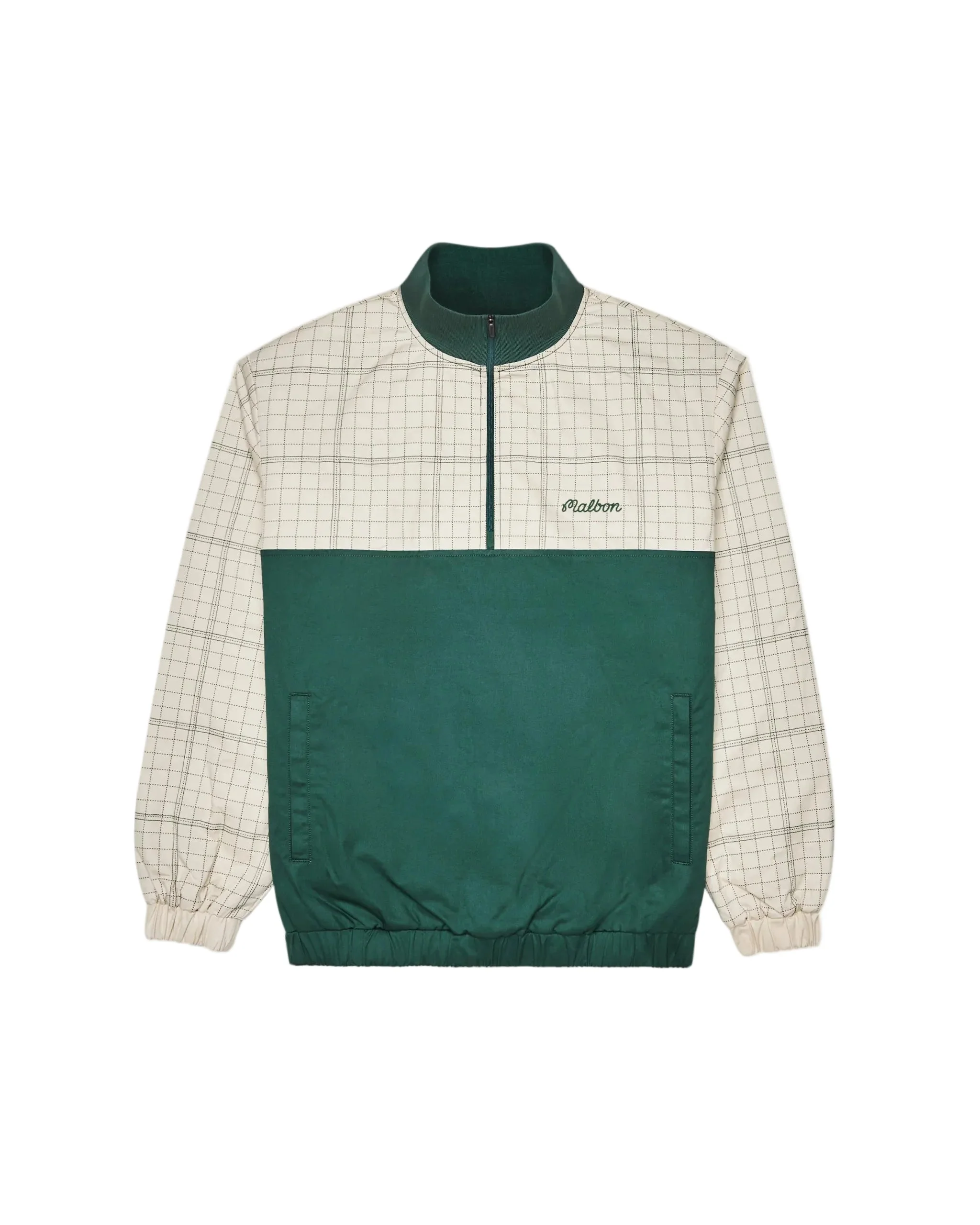 Spruce Quarter Zip by Malbon features a plaid cotton design with poly lining, stand collar, and side pockets. The relaxed fit includes elastic cuffs and waist, complemented by embroidered Malbon logos on the chest and back. A versatile seasonal essential.