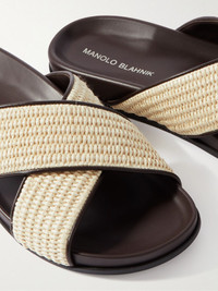 Manolo Blahnik's 'Chiltern' sandals are an appropriate and elegant choice for stepping out all summer. They're defined by crossover raffia straps and trimmed with contrast leather piping. The footbeds are moulded for support and comfort. Size & Fit - Fits true to size. Take your normal size - UK sizing Details & Care - Raffia, dark-brown leather (Calf)
