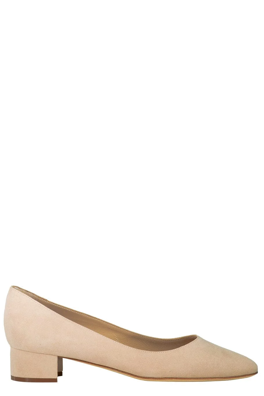 DETAILS AND INSIGHT Manolo Blahnik listony samba tondo pump in nude. 30mm 100% Suede Upper 100% Leather Sole Made in Italy Style 9XX-0446-0017