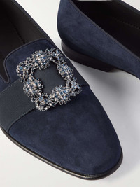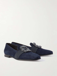 Manolo Blahnik's 'Carlton' loafers have been crafted in Italy from navy suede and adorned with crystal-embellished buckles. They're trimmed with grosgrain and make a polished finishing touch for evening looks. Size & Fit - Fits true to size. Take your normal size - UK sizing Details & Care - Navy suede (Goat) and grosgrain