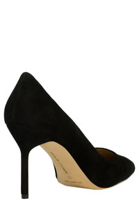 DETAILS AND INSIGHT Manolo Blahnik suede bb pump in black. 90mm 100% Suede Upper, 100% Leather Sole Made in Italy Style 9XX-0416-0011