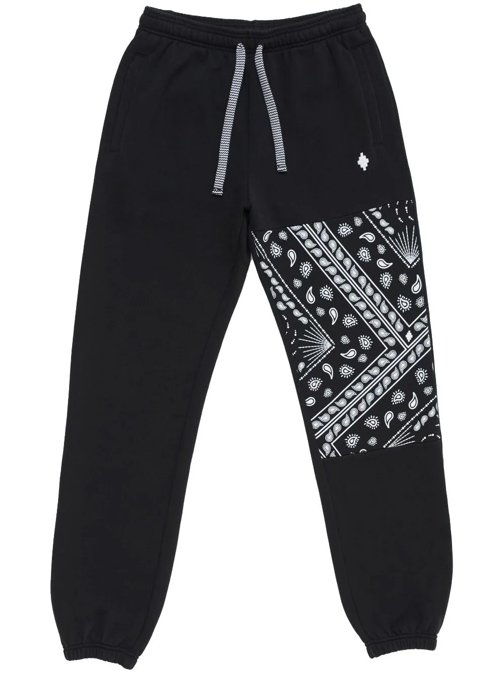 bandana-print panelled cotton track pants Known for bold graphic designs, Marcelo Burlon County of Milan presents these black track pants. Made from soft cotton, they're characterised by a contrasting panel decorated with a bandana print. Chevron drawstrings and the brand's signature Cross motif add the final touch. Highlights - Black/white - Cotton - Bandana print - Contrasting panel detail - Signature cross motif - Elasticated drawstring waistband - Two side welt pockets - Rear welt pocket - Elasticated ankles Imported Composition Cotton 100%, Polyester 100% SIZE & FIT FittingInformation Designed for a relaxed straight leg, allowing a comfortable and loose fit over the leg This piece fits true to size – take your usual size