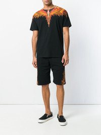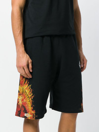 flames wings shorts Filled with the nineties spirit, for SS18 Milan-based fashion powerhouse Marcelo Burlon combines elegant edginess with a ‘beachy’ goth aesthetic. In this collection you can find vivid colors, oversized trench coats, animal prints, striped patterns, “gothic beach” graphic prints and denim. These black cotton flames wings shorts feature an elasticated drawstring waist, a knee length and a flames wings print to the side. Imported Composition Cotton 100% SIZE & FIT Model measurements Height 6 ft 1 in(1.85 m) Bust/Chest 37.79 in(96 cm) Hips 37.4 in(95 cm) Waist 30.7 in(78 cm) Washing instructions Machine Wash