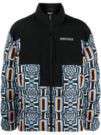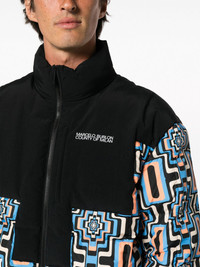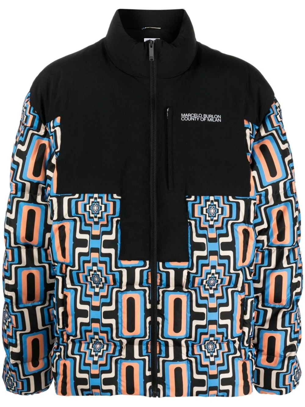 geometric-print quilted puffer jacket Padded with feather down for insulating properties, this quilted puffer jacket from Marcelo Burlon County of Milan is made in Italy and emblazoned with a seasonal geometric print throughout for a streetwear-inspired finish. Highlights - Black/multicolour - Padded design - Geometric print - Quilted - Funnel neck - Front zip fastening - Embroidered logo at the chest - Long sleeves - Elasticated cuffs - Straight hem Made in Italy Composition Lining: Polyester 100%, Polyamide 100% Outer: Polyester 100%, Polyamide 100% SIZE & FIT Model measurements Height 6 ft 2 in(1.89 m) Bust/Chest 37.79 in(96 cm) Hips 37 in(94 cm) Waist 29.92 in(76 cm) Washing instructions Machine Wash