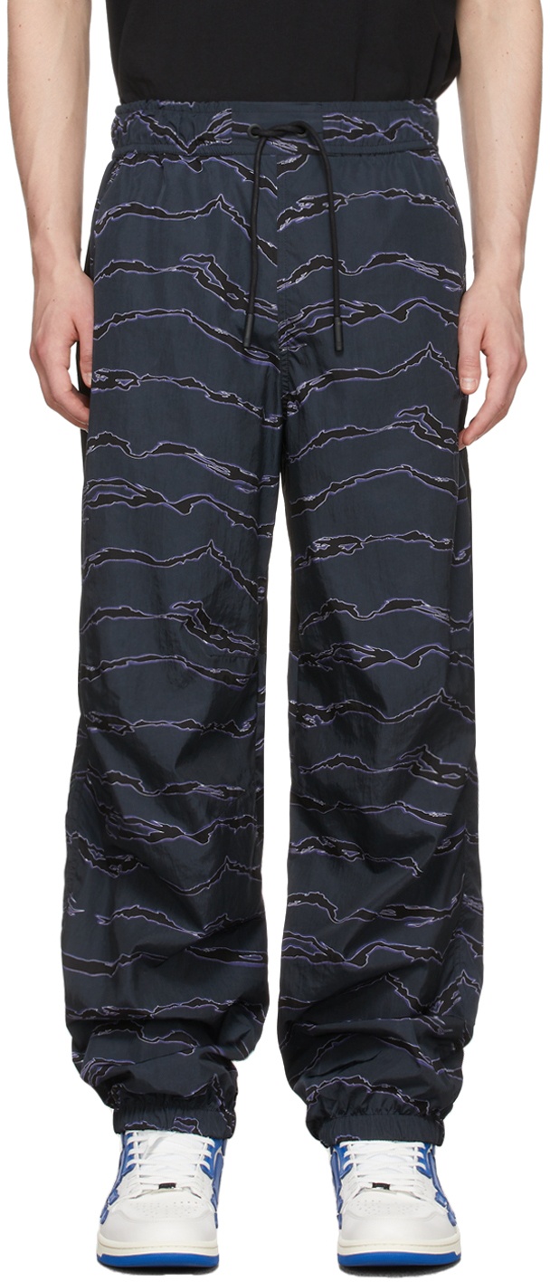 Nylon taffeta lounge pants in navy featuring camouflage pattern in purple, black, and white. Supplier color: Dark blue 100% nylon.