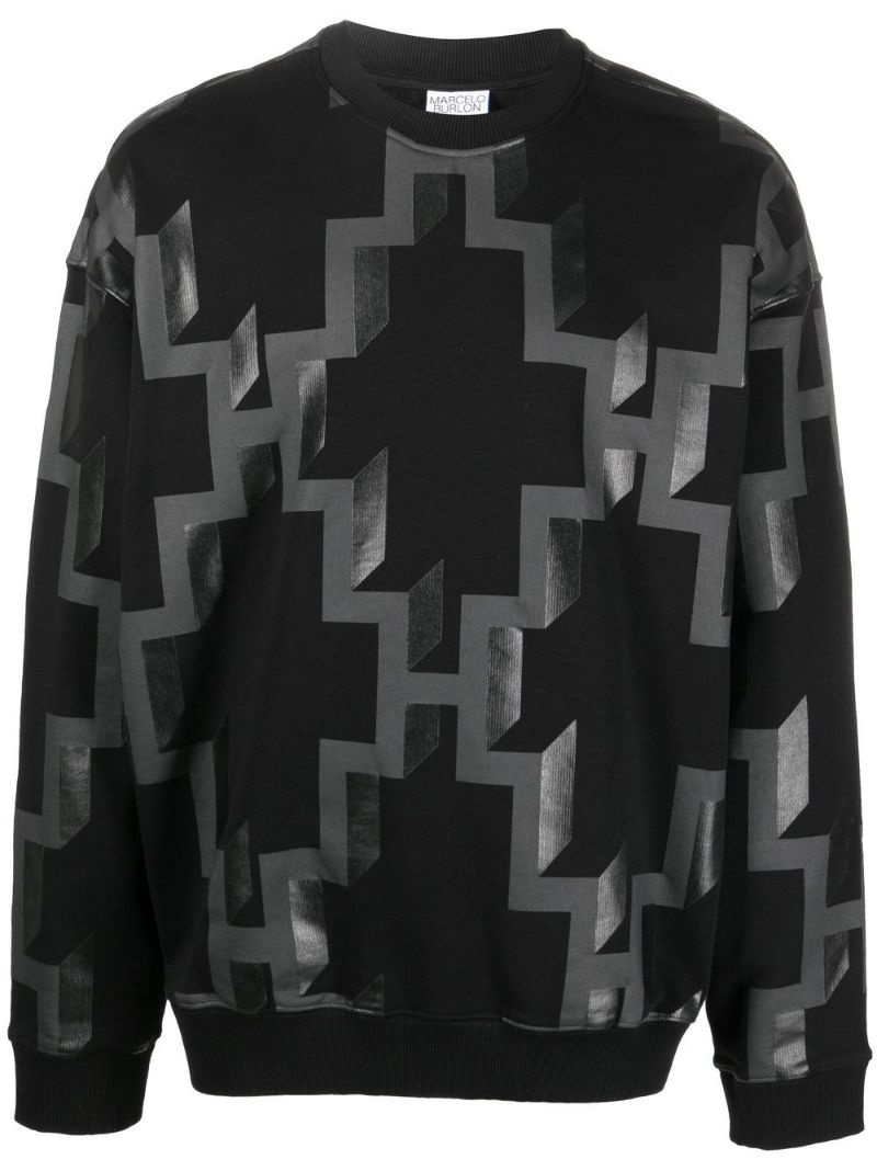 logo-print cotton sweatshirt logo-print cotton sweatshirt from Marcelo Burlon County of Milan featuring black/grey, cotton, all-over logo print, crew neck, long sleeves and straight hem. Imported Composition Cotton 100% SIZE & FIT Model measurements Height 6 ft 0 in(1.84 m) Bust/Chest 36.2 in(92 cm) Hips 38.6 in(98 cm) Waist 29.1 in(74 cm) FittingInformation This piece fits true to size. We recommend you get your regular size Cut for a loose fit Made with a mid-weight fabric