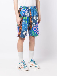 multi-panel knee-length shorts Marcelo Burlon County of Milan adds a creative twist to the brand's signature understated style. Here, different panels of printed fabric are used to create a pair of tailored shorts with an eye-catching effect. Highlights - Blue/multicolour - All-over mixed print - Elasticated waistband - Two side slit pockets - Rear welt pocket Made in Italy Composition Polyester 65%, Cotton 35% SIZE & FIT Model measurements Height 6 ft 2 in(1.87 m) Bust/Chest 36.2 in(92 cm) Hips 37.8 in(96 cm) Waist 28.3 in(72 cm) FittingInformation Designed with a wide leg, offering a loose and roomy fit The elasticated waist allows for a comfortable fit Made from a midweight non-stretch fabric This piece fits true to size – take your usual size
