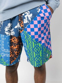 multi-panel knee-length shorts Marcelo Burlon County of Milan adds a creative twist to the brand's signature understated style. Here, different panels of printed fabric are used to create a pair of tailored shorts with an eye-catching effect. Highlights - Multicolour - Multi-panel design - Elasticated waistband - Two side slit pockets Made in Italy Composition Outer: Polyamide 100%, Polyester 100% Lining: Polyester 65%, Cotton 35% SIZE & FIT Model measurements Height 6 ft 1 in(1.85 m) Bust/Chest 38.58 in(98 cm) Hips 37 in(94 cm) Waist 30.31 in(77 cm) FittingInformation Designed for a regular fit, offering an even fit over the leg Adjust this piece’s waistband to your preference using the drawstring Made from a lightweight non-stretch fabric This piece fits true to size – take your usual size Washing instructions Machine Wash