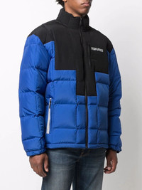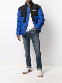 quilted cross block jacket Seeking inspiration from his Argentinian heritage, designer Marcelo Burlon infuses cultural references into his collections. Partially displaying the brand's signature cross motif with black panelling, this quilted jacket from Marcelo Burlon County of Milan pays homage to the geometric designs worn by gauchos. Highlights - Blue/black - Recycled nylon-blend - Signature cross motif - Quilted - Two-tone design - Logo print at the chest - Funnel neck - Long sleeves - Front zip fastening - Two zip-fastening pockets Made in Italy Composition Outer: Polyester 42% Lining: Polyester 100% Recycled Polyamide 58% SIZE & FIT Model measurements Height 6 ft 1 in(1.85 m) Bust/Chest 38.58 in(98 cm) Hips 37 in(94 cm) Waist 30.31 in(77 cm) FittingInformation This piece fits true to size. We recommend you get your regular size Cut for a loose fit Made with a mid-weight non-stretch fabric Washing instructions Machine Wash