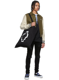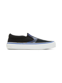 Low-top canvas slip-on sneakers in black. · Signature graphic printed in tones of white, blue, and black at front · Tonal elasticized gusset at sides of tongue · Padded collar · Tonal leather trim with white printed logo at heel · Rubber midsole in white with stripe in navy and embossed logo at heel · Treaded rubber outsole in white Supplier color: Black/Blue Upper: textile. Sole: rubber.