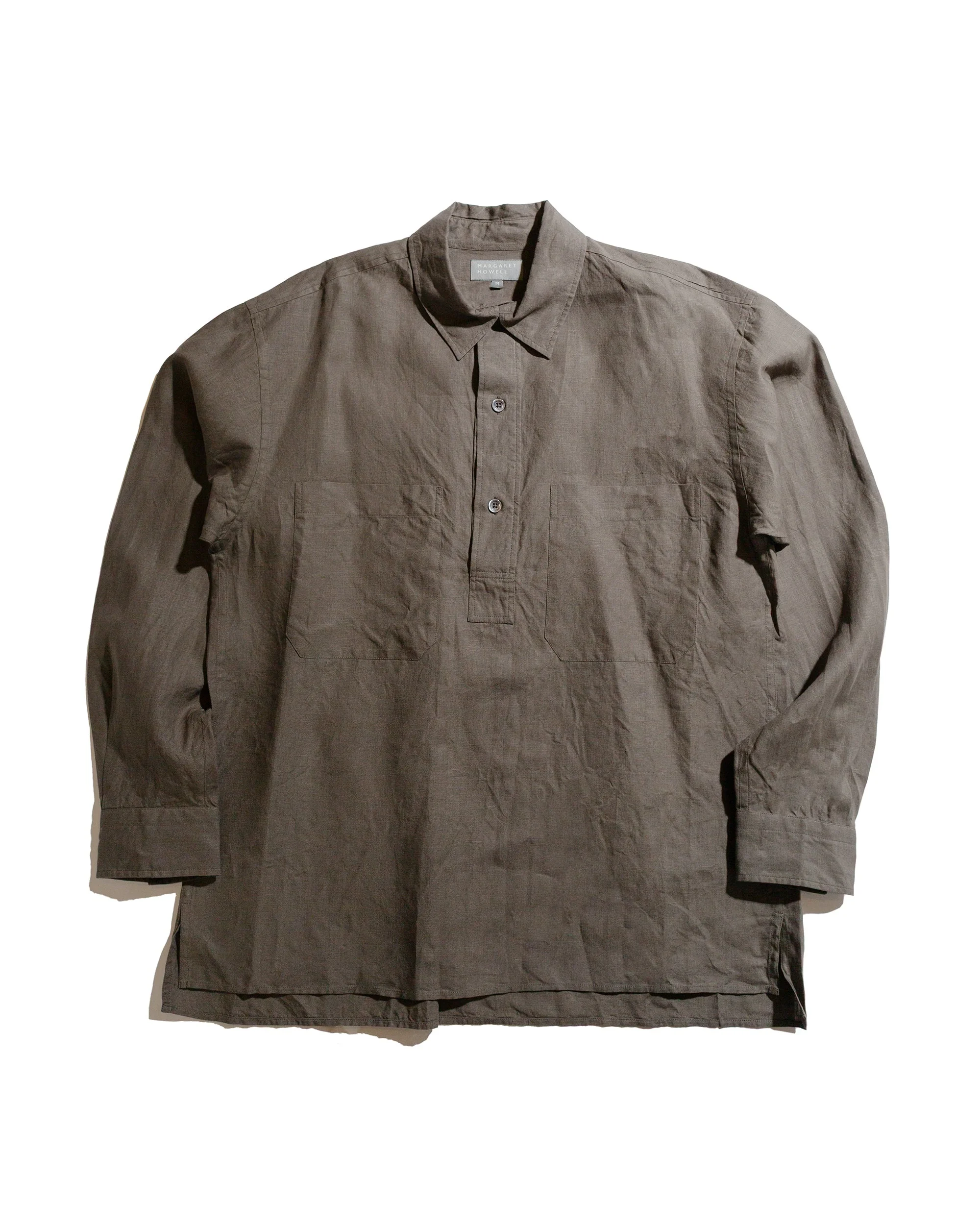 We're picky with our popovers. There are two things we will test. Fabric and ease of pulling over. Fabric was a no brainer. Beige linen. That was the easy part. Then we had the pulling over. And the pulling over my friends was a chef's kiss, giving this bad boy a Super Trooper's pullover approved. DETAILS - Irish linen from Spence Bryson - Half placket with box stitch detailing - Patch chest pockets - Stepped hem with deep side splits - Rear box pleat & hanger loop - Mother of pearl buttons - 100% linen - Made in England - Individually made in Margaret Howell's London workroom - Model is 6'0” (183cm), 150lbs (68kg) and wearing M