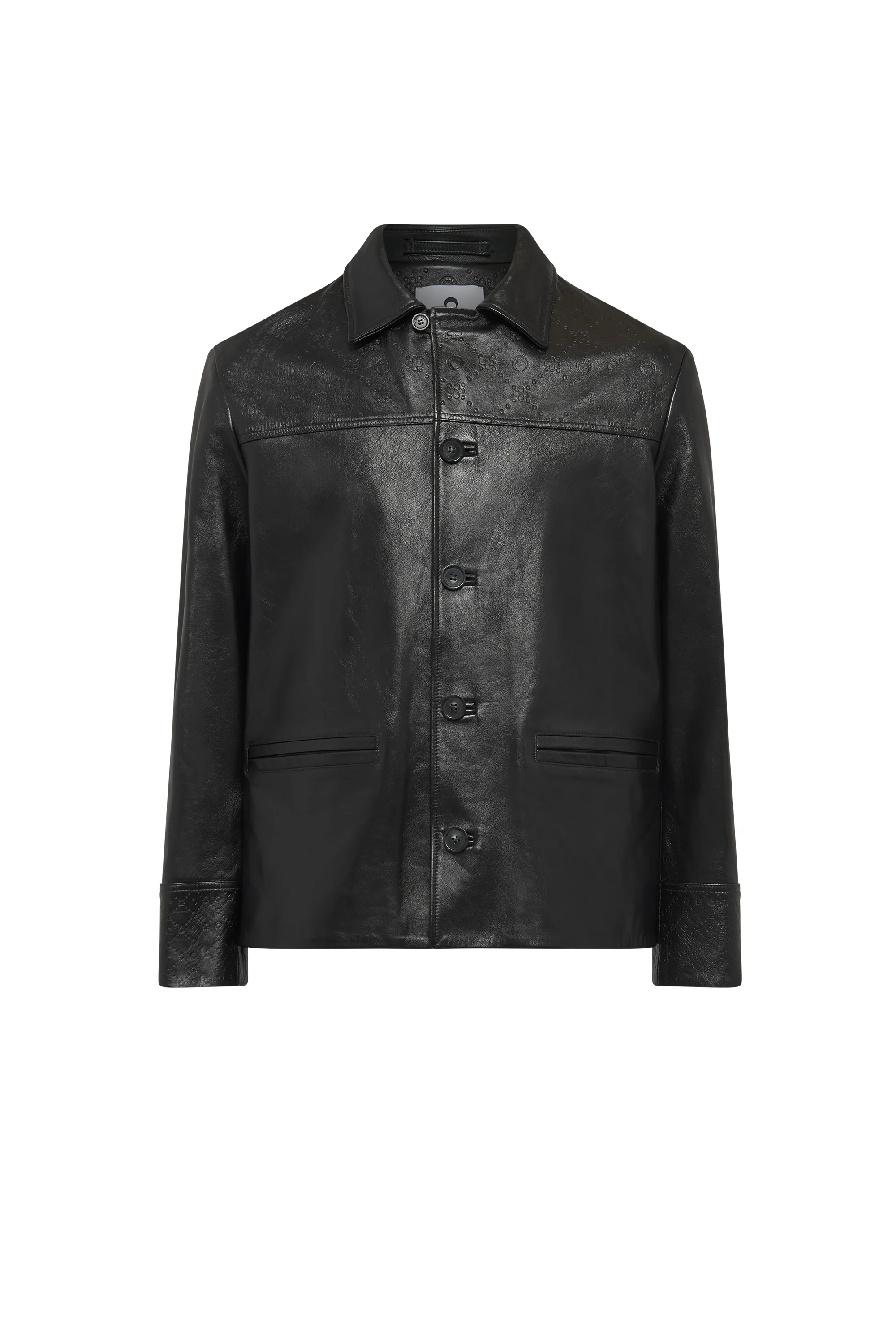- Signature Moonogram embossed leather upper yoke and cuffs - Button and loop at collar to allow closure - Four button front - Leather lining in cuffs allow them to be rolled up - Two welted pockets in front - Interior zipped pocket - Signature Moon jacquard lining - Branded leather patch in back below neck Materials Moonogram Embossed Leather A staple of Marine Serre Couture, this premium sheepskin leather is made in Italy and has a satin sheen that naturally gives off light, as though it has already acquired a delicate patina over time. The grained, structured leather is then heat-embossed to reveal the house’s Moonogram print. The pieces in this range draw inspiration from classic tailoring codes, which merge seamlessly with Marine Serre’s resolutely contemporary vision: women’s styles, from fitted coats and jackets, to a glamorous bustier dress, are fitted to follow the curves of the body. The men’s pieces are modern and luxurious wardrobe staples. 100% Lambskin
