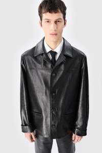 Boxy jacket with a bowling collar Product Detail - Signature Moonogram embossed leather upper yoke and cuffs - Button and loop at collar to allow closure - Four button front - Leather lining in cuffs allow them to be rolled up - Two welted pockets in front - Interior zipped pocket - Signature Moon jacquard lining - Branded leather patch in back below neck Composition and Traceability Product details page relating to environmental qualities or characteristics MJA065B RLEA0021 BK99 BLACK Composition: Base Material: 100% Sheep Skin - Lining: 100% Viscose LWG certified tannery Traceability: Weaving, Dyeing, Manufacturing: Italy