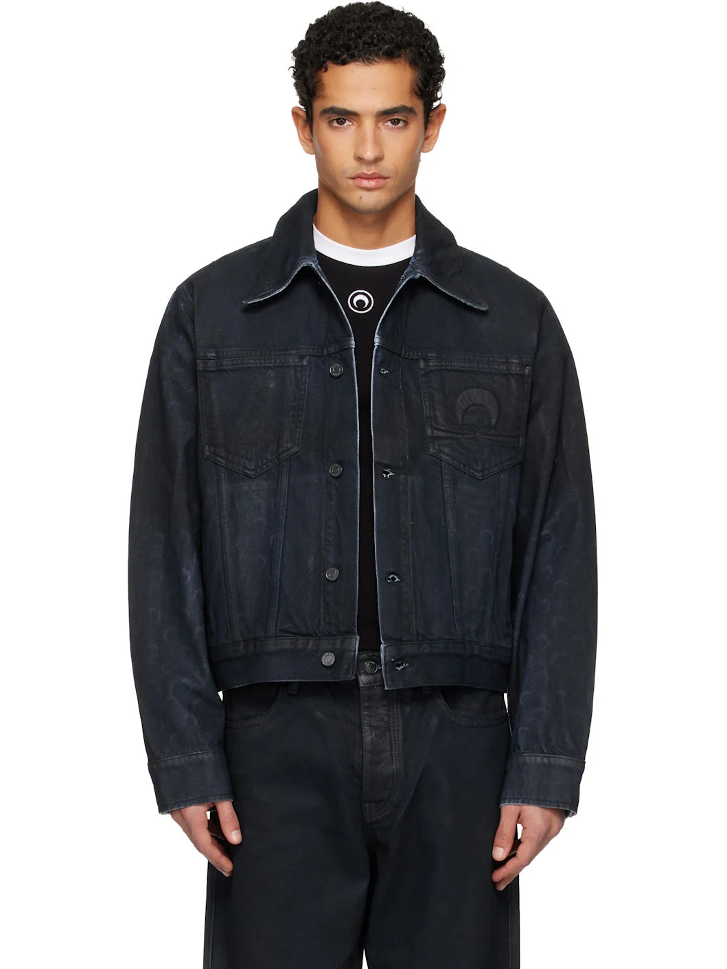 Coated non-stretch denim jacket. · Fading and printed logo pattern throughout · Spread collar · Button closure · Patch pockets at chest · Welt pockets at front · Buttoned barrel cuffs · Logo patch at back collar · Adjustable button tabs at back hem Supplier color: Black 100% cotton. Made in Turkey 252020M177001