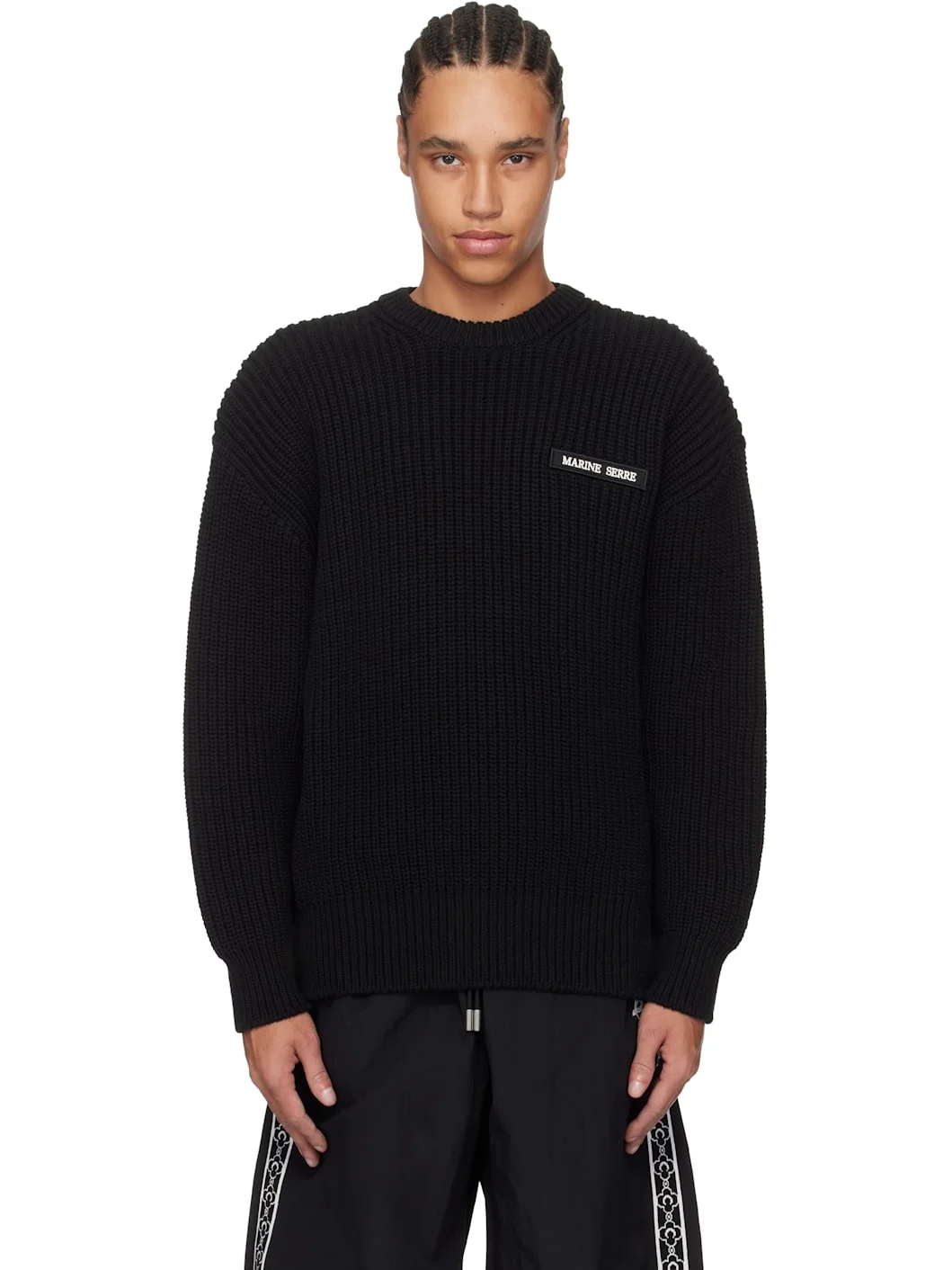 Rib-knit cotton sweater. · Crewneck · Embroidered logo patch at chest · Dropped shoulders Supplier color: Black 100% cotton. Made in Romania 251020M201000