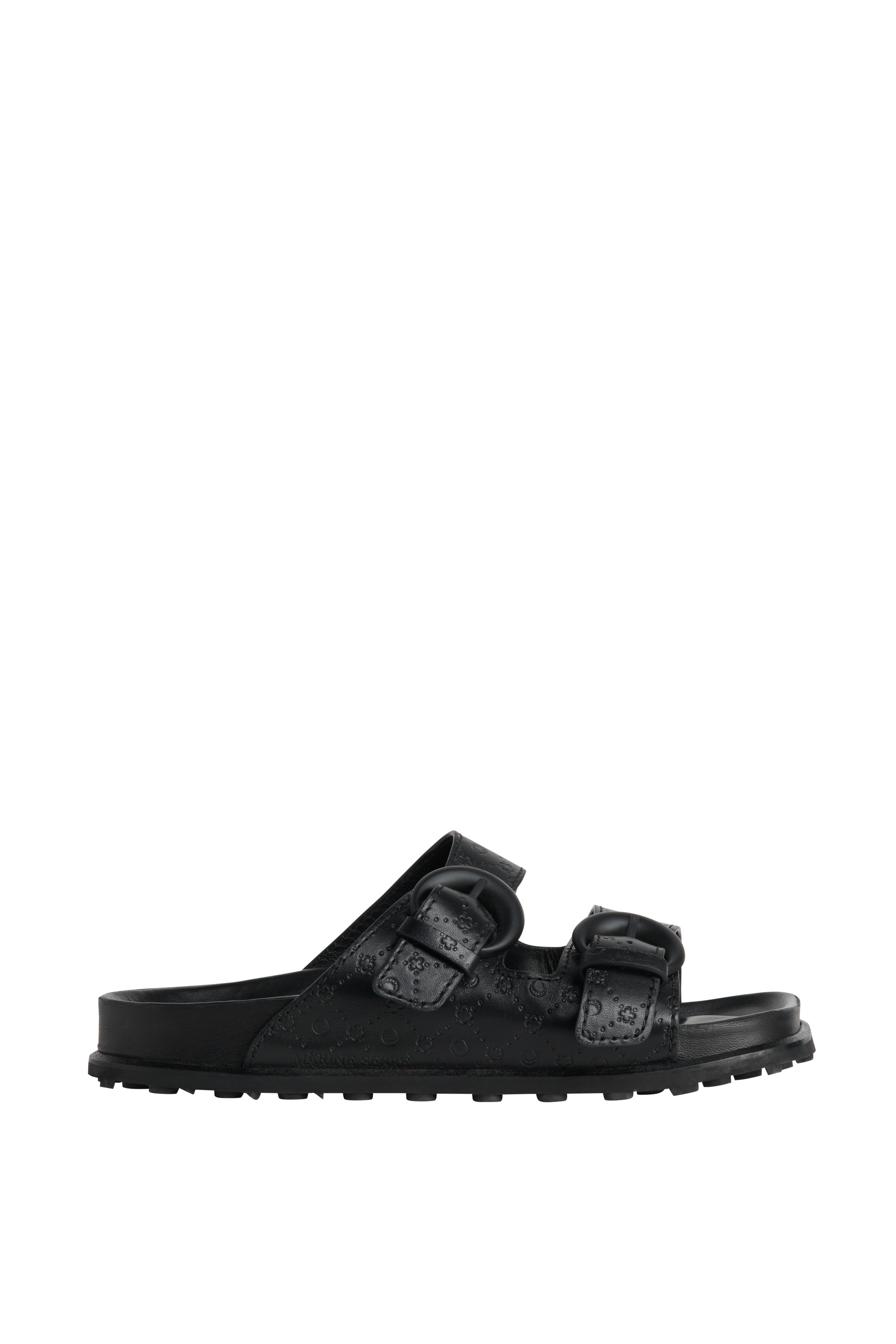 Iconic All Over Moon outsole Moon shaped buckles Welted sole Hand covered footbed Materials Black Embossed Leather Over the years, Serre has learned to master deadstock leather, favoring it as one of the cornerstone materials of the house. The embossed Moonogram pattern reinforces the branded look. 100% Sheep Leather