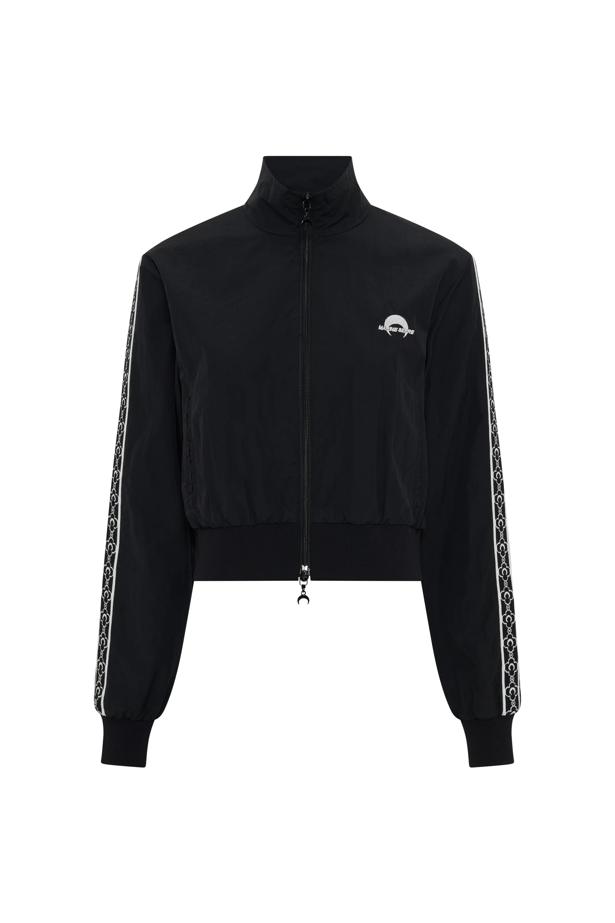 - Double zipped front with signature Moon puller - Two welted side pockets - Knitted logo tape on side sleeves - Ribbed cuffs and hem - Mesh lining - MARINE SERRE SPORT logo embroidered on left chest Materials Ms Sport Nylon Black This sporty fabric is a fixture for Marine Serre. The material is composed of a mixture of GRS-certified recycled nylon and cotton which is made in Italy. Water-repellent and soft to the touch, it has a washed texture as if it has taken on natural creasing with wear — a subtle detail that nonetheless elevates it to the rank of high-end sportswear. The unisex pieces in this range are intended for everyday casual wear. The track jacket, already a new icon for the house, has been carried over from last season, while the baggy track pants have morphed into a more dramatic balloon shape; both these pieces feature the MS Sport logo embroidered in white thread. The raincoat, which also features the MS Sport logo on the rear, has practical details like an adjustable hood and adjustable cuffs. The women’s range borrows technical details from hiking gear and is a stylish hybrid of couture and sportswear. The bustier, for instance, has elastic cord and adjustable cord stoppers at the bust so wearers can adjust the fabric to suit their chest size. 74% Polyamide - 57% Recycled (GRS Certified), 26% Cotton