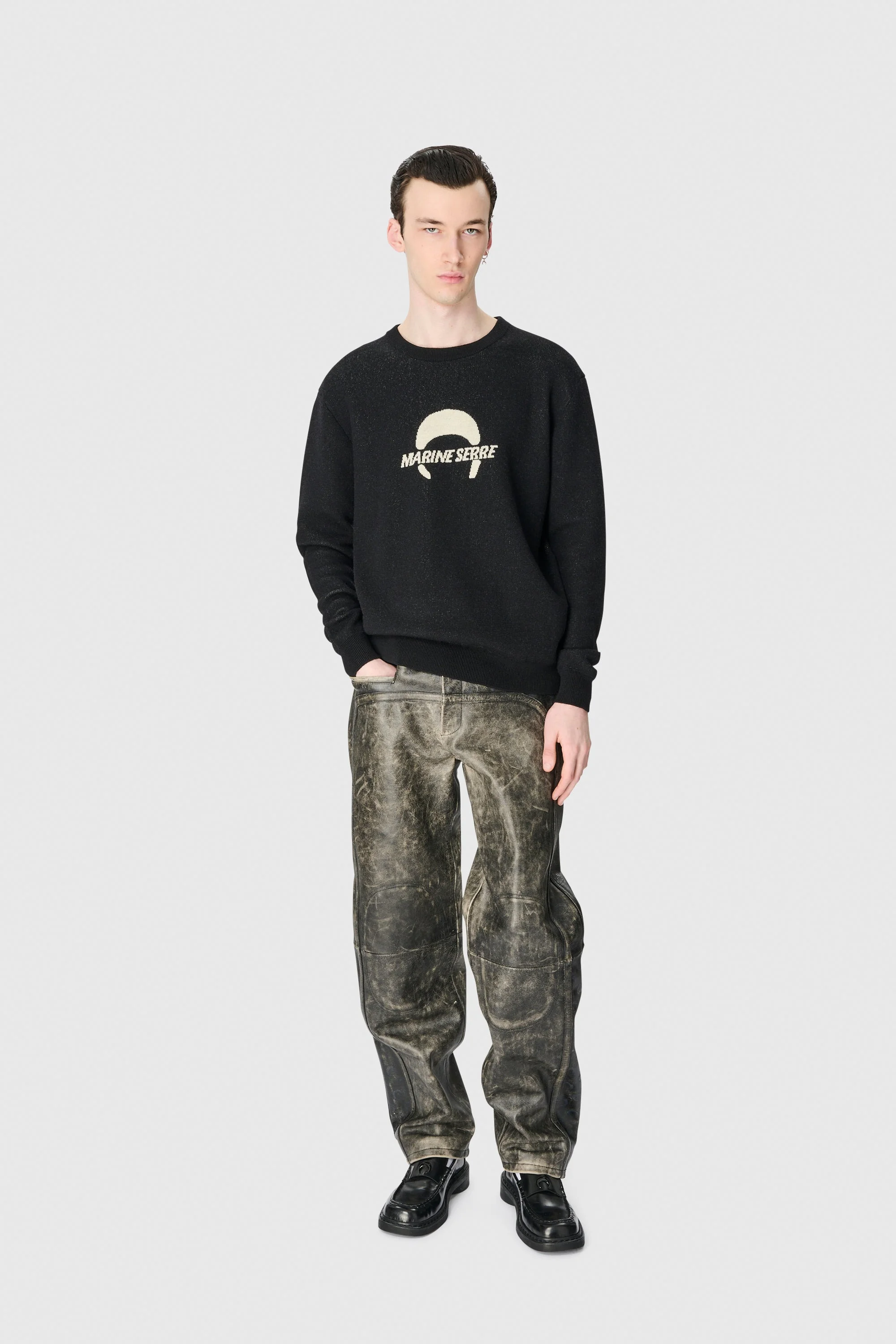 - Ribbed neckline - Dropped shoulders - Ribbed sleeves and bottom finishings - Jacquard stitch with center front artwork - Jacquard moon logo - Hotfix moon logo patch Materials MERINO WOOL KNIT 100% WOOL