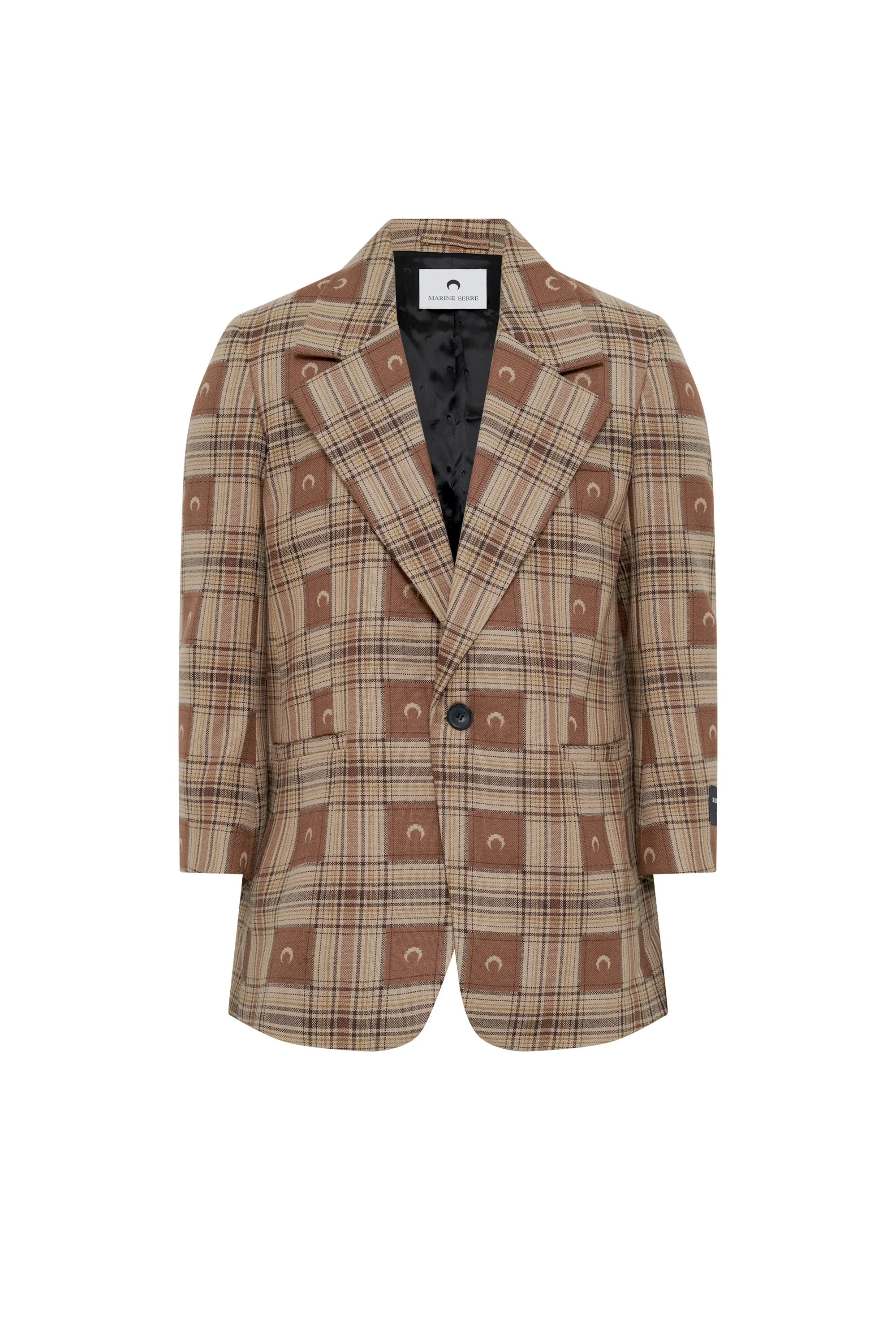 - Single button front closure - Enameled signature Moon button - One chest pocket and two side flap pockets - Interior pockets - Shoulder pads - Rear vent - Moon Checks jacquard all over - Signature Moon jacquard lining - MS Tailor label woven on back yoke Materials Moon Checks Jacquard New for this season, Moon Checks Jacquard is an RWS-certified wool jacquard that is woven in Italy and features a fusion of the Marine Serre Moon and a check pattern in neutral earth tones. Italian tailoring has strongly permeated the new collection, which has been constructed as an ode to the country’s savoir-faire. After conducting extensive research into potential new tailoring materials — always with the challenge of sourcing dormant fabrics suitable for generation — we settled upon rolls of red and grey fabric, the basis of the Regenerated Tailoring range. For men, a fitted double-breasted jacket designed for formal occasions is joined by an elongated jacket with exaggerated shoulders that’s versatile enough to appeal to women too. Women’s garments include a coat and jacket whose discreet shoulders, simple button closure and generously open neckline recall the Moon Airbrushed leather suit jacket. Sensual, lighter pieces include a strapless dress cinched above the bust by a removeable leather belt, and a pleated mini skirt. Pair it with one of the collection’s knits for a collegiate look. Base material: 100% Wool - Lining: 100% Viscose