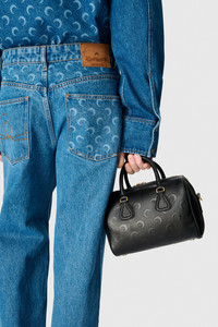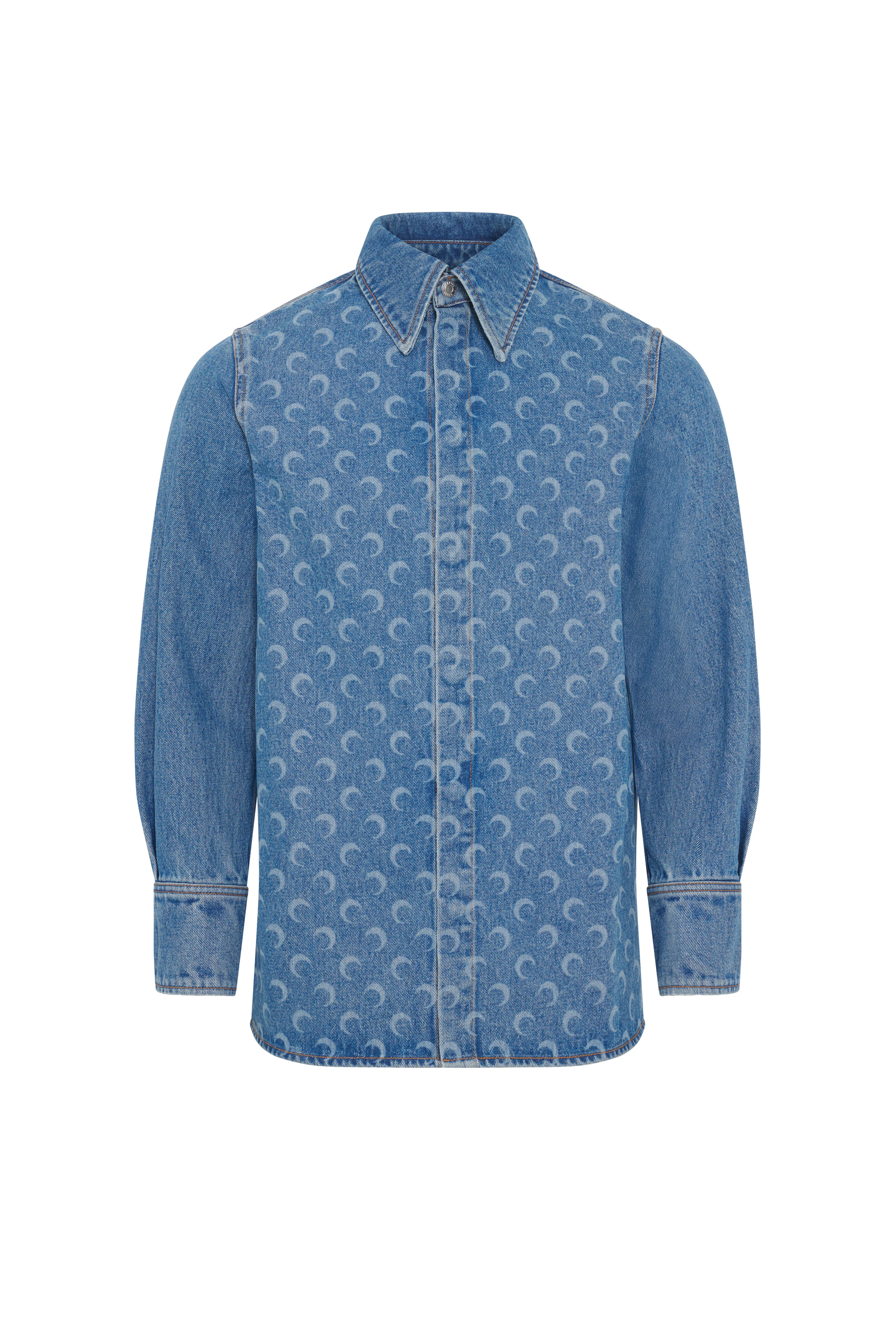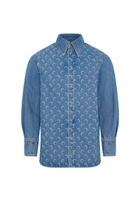 - Buttoned front - Buttoned sleeve cuffs - Signature moon laser-printed all over - Marine Serre leather patch Materials Moon Laser Denim Blue Marine Serre offers a 100% GOTS Certified Organic denim twill family of garments, in addition to a Regenerated one. For this new family of denims, Marine Serre has opted for a light washed classic indigo as well as a striking black variant. 100% Cotton (GOTS Certified)