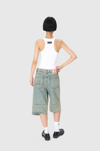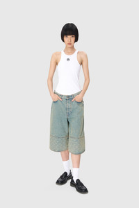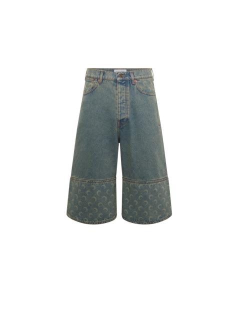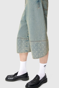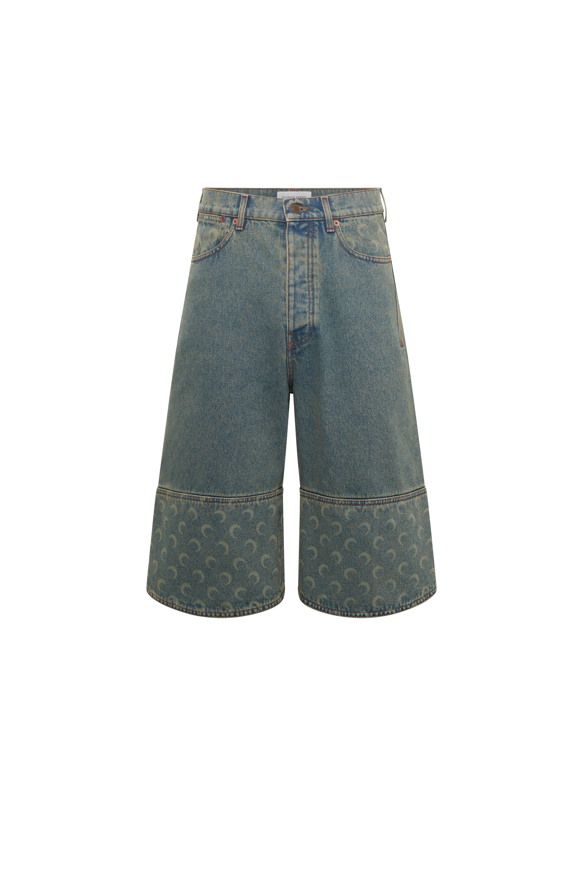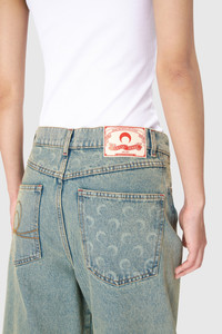 - Five pockets - Shank buttons front closure - Cut-out on bottom hem - Belt loops on waistband - Moon embroidery on back left pocket - Branded jacron woven on back waistband - Signature Moon laser printed all over under the back belt, on pockets and on bottom panels - Logo engraved on button Materials Moon Laser Denim The appeal of our All Over Moon denim never wanes, with this classic fabric returning again and again. Made from a GOTS-certified organic cotton canvas, our indigo denim is stonewashed to produce a light blue, sand and purple blue shades; the latter is also treated with a pigment spray to achieve a really vibrant gradient effect that fades to a paler purple at the sides of the garment. After stonewashing, the All Over Moon is laser-printed onto the pieces, its placement differing for each. All are finished with red reinforcement stitches, logo-engraved metal buttons, and a Marine Serre jacron back patch. 100% Coton (GOTS Certified)
