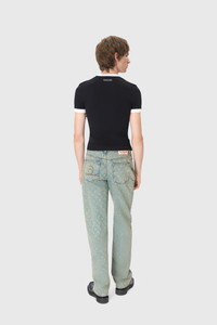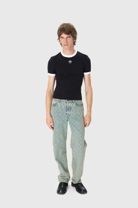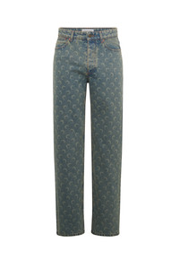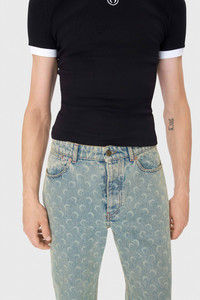 - Five pockets - Shank buttons front closure - Belt loops - Embroidery on back left pocket - Branded jacron woven on back waistband - Signature Moon laser printed all over on front and back - Sanded airbrushed detail on inside and outside seams and on middle leg whiskers - Logo engraved on button Materials Moon Laser Denim The appeal of our All Over Moon denim never wanes, with this classic fabric returning again and again. Made from a GOTS-certified organic cotton canvas, our indigo denim is stonewashed to produce a light blue, sand and purple blue shades; the latter is also treated with a pigment spray to achieve a really vibrant gradient effect that fades to a paler purple at the sides of the garment. After stonewashing, the All Over Moon is laser-printed onto the pieces, its placement differing for each. All are finished with red reinforcement stitches, logo-engraved metal buttons, and a Marine Serre jacron back patch. 100% Coton (GOTS Certified)