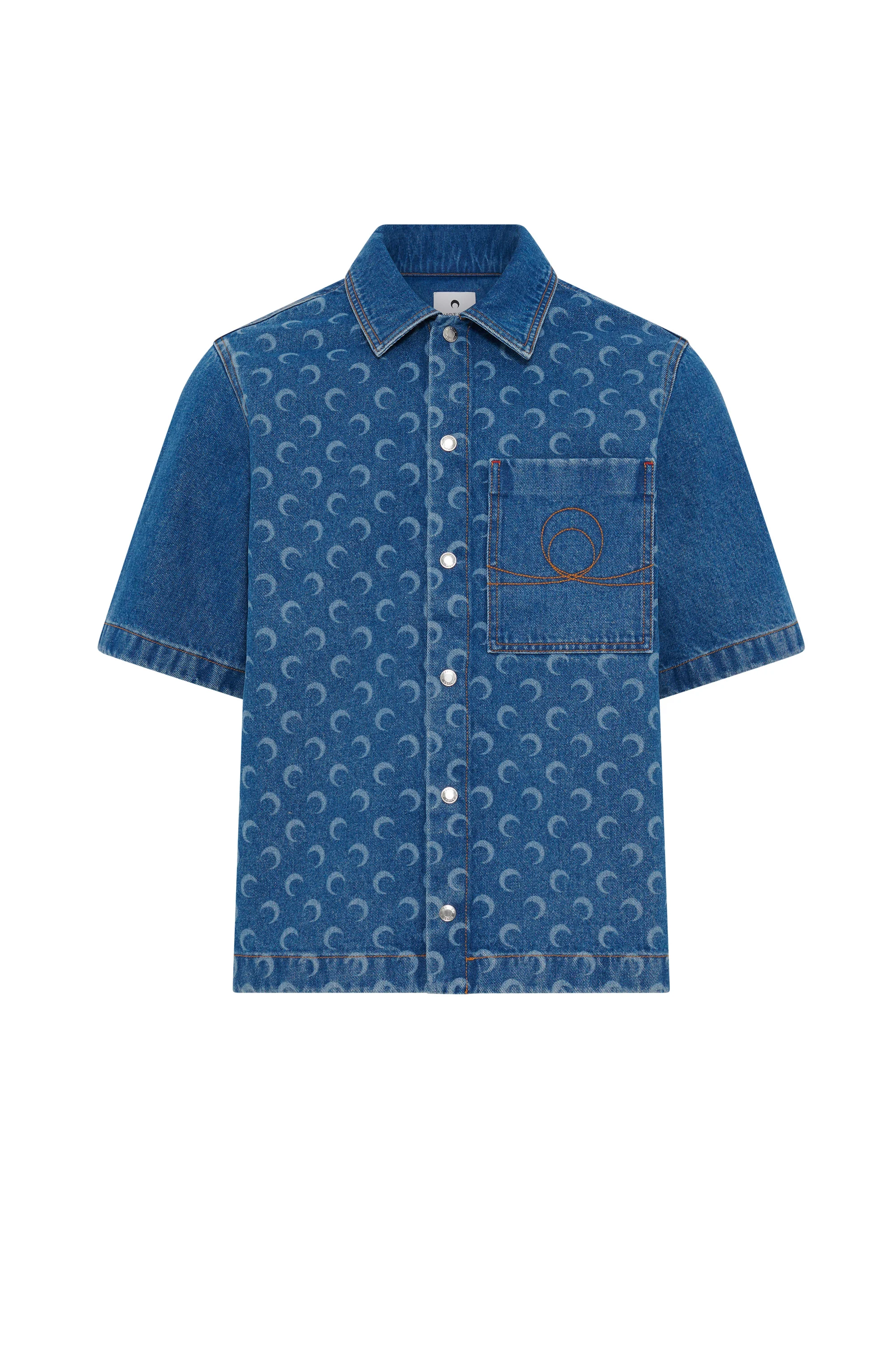 - Buttoned front - One patch pocket with embroidery on the chest - Signature moon laser printed all over - Marine Serre leather patch Materials Moon Laser Denim Blue Marine Serre offers a 100% GOTS Certified Organic denim twill family of garments, in addition to a Regenerated one. For this new family of denims, Marine Serre has opted for a light washed classic indigo as well as a striking black variant. 100% Cotton (GOTS Certified)