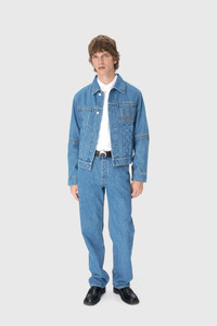 Regular fit trucker jacket with a shirt collar Product Detail - Buttoned front - Two chest pockets - Welted side pockets - Buttoned sleeve cuffs - Middle cut on sleeves - Adjustable waist - Embroidery on front left pocket - Branded jacron woven under neck in back - Signature Moon laser printed all over on front yoke - Logo engraved on buttons Composition and Traceability Product details page relating to environmental qualities or characteristics MJA063A CDEN0002 BL05 LIGHT BLUE Composition: Base Material: 100% Cotton - Lining: 100% Cotton Traceability: Weaving/Dyeing: Morocco Manufacturing: Italy