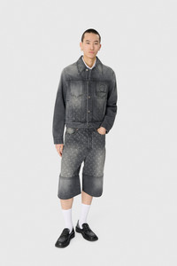 Boxy fit trucker jacket with shirt collar and long sleeves Product Detail - Buttoned front - Two chest pockets - Welt side pockets - Buttoned sleeve cuffs - Adjustable waist - Signature moon laser printed all over on front panels - Marine serre leather patch Composition and Traceability Product details page relating to environmental qualities or characteristics MJA063B_CDEN0006_GR90_DARK_GREY Composition: Base Material: 100% Cotton Traceability: Weaving/Dyeing/Manufacturing: Italy