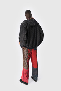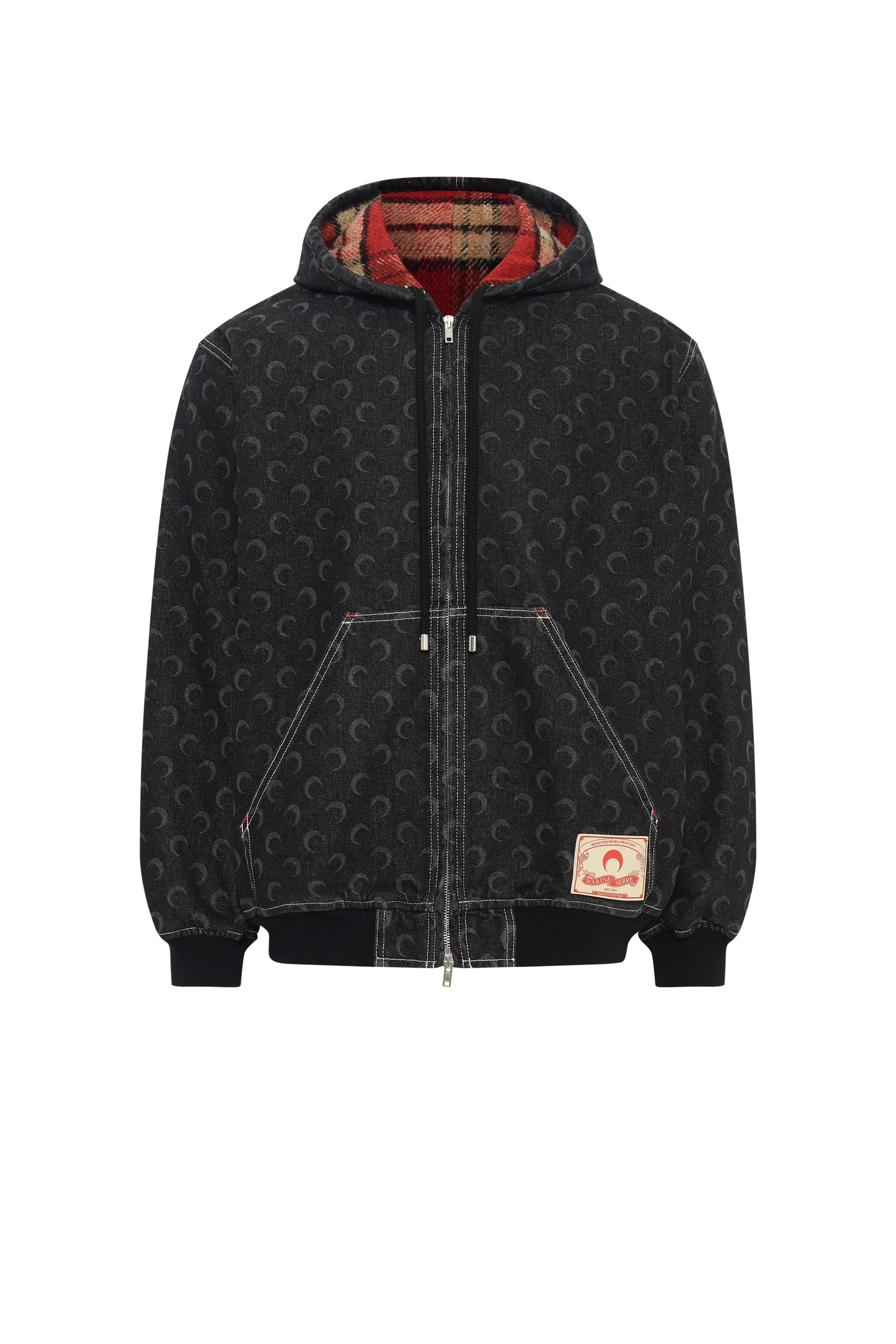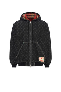 - Adjustable hood with drawstrings - Double zipper front closure - Quilted padding on sleeves - Two front pockets - Ribbed cotton cuffs and hem - Moon allover laser printed denim allover - Deadstock checkered wool lining - Jacron with logo on left pocket - Logo engraved on zip puller Materials Moon Laser Denim Black 100% Cotton