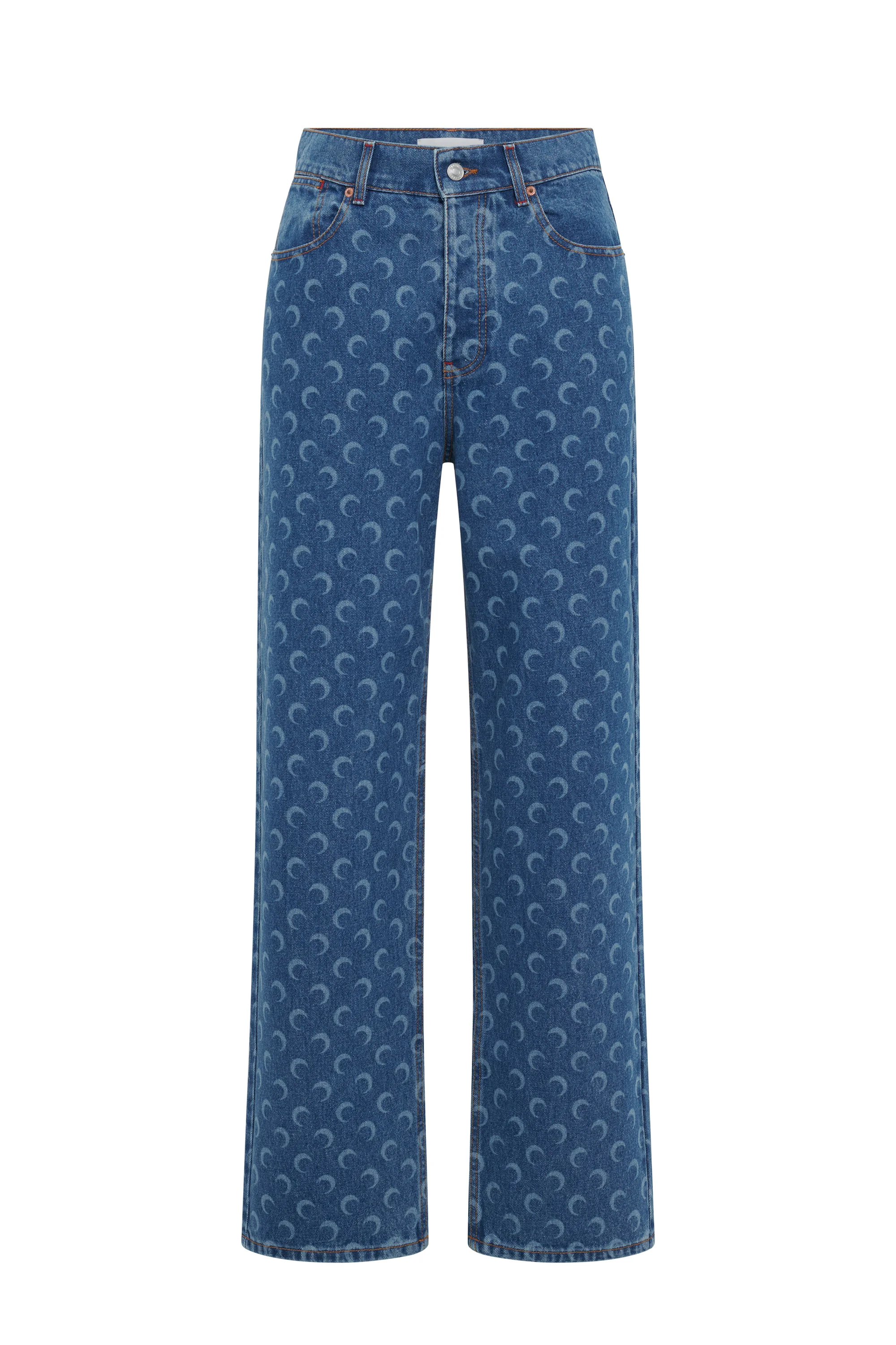 - Zipper and button - Five pockets - Belt loops - Signature moon laser printed all over - Cotton twill on front pockets - Marine Serre leather patch Materials Moon Laser Denim Blue Marine Serre offers a 100% GOTS Certified Organic denim twill family of garments, in addition to a Regenerated one. For this new family of denims, Marine Serre has opted for a light washed classic indigo as well as a striking black variant. 100% Cotton (GOTS Certified)
