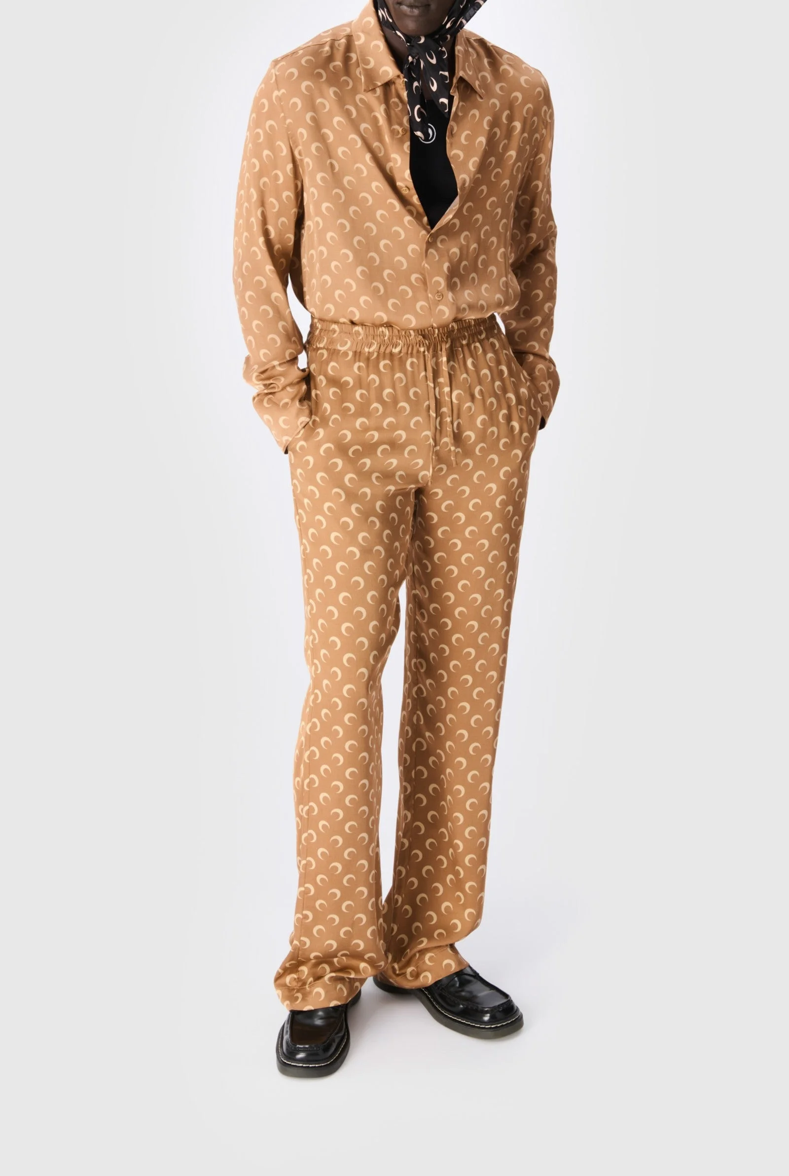Straight grain cut Tailored sleeves with plackets and two button cuffs Seven button front Darted front Rolled hem Logo engraved buttons Materials Moon Printed Flou Dark Camel 100% Viscose