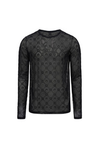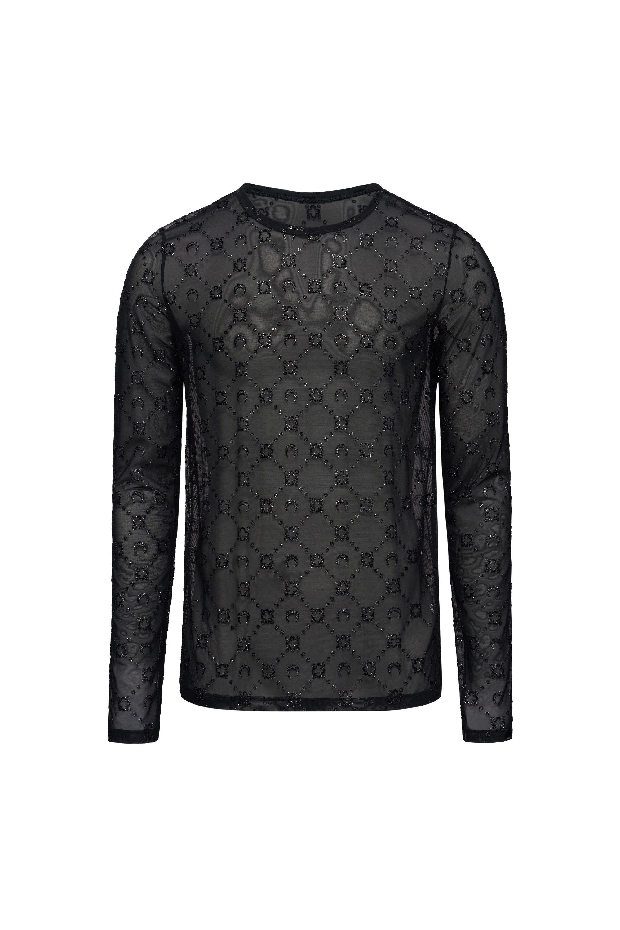 Ribbed crewneck collar Overlock around armholes and side seams MARINE SERRE brand label on bottom left sleeve Cover stitching along hem and cuffs Materials Mesh Flock Glitter 86% POLYAMIDE , 14% ELASTANE
