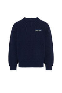 Double layered ribbed neckline Dropped shoulders with oversized sleeves Tight knit cuffs and hem Branded velcro badge on left chest Materials Ms Half Cardigan Knit Navy 100% Merino Wool