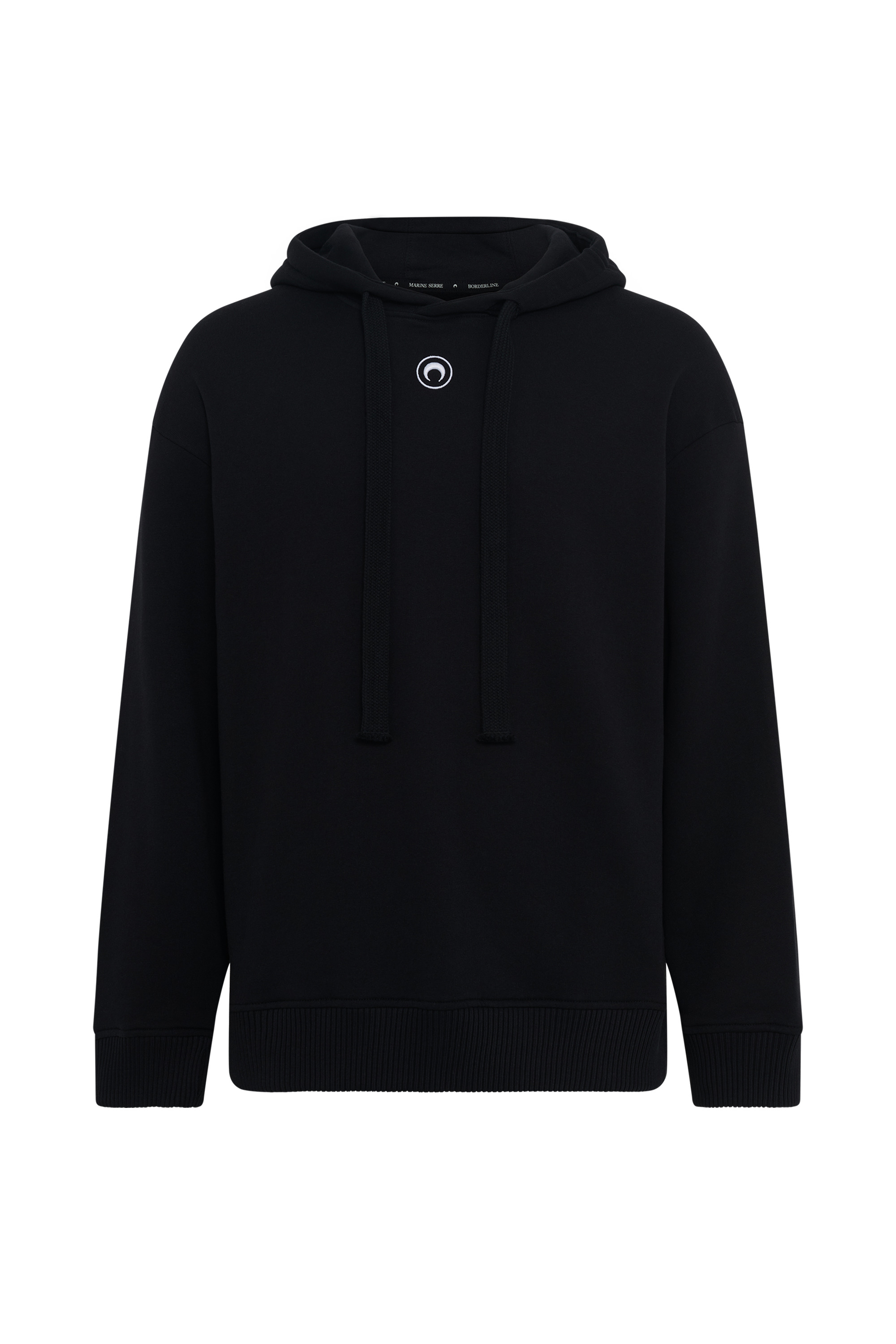 - Ribbed hem and cuffs - Flat cotton cord with frayed ends in off-white - Contrasted white embroidered circle Moon logo in center below front collar - Black MARINE SERRE branded label on lower left side - MARINE SERRE Borderline label on the top back below hood - MARINE SERRE Borderline ribbon tape inside collar Materials RECYCLED COTTON FLEECE The House is always seeking new sustainable methods to produce innovative and core fabrics and this season the GOTS certified organic cotton fiber used in our fleece is mixed with recycled cotton and cotton sourced from regenerative agriculture. 100% GOTS certified organic cotton
