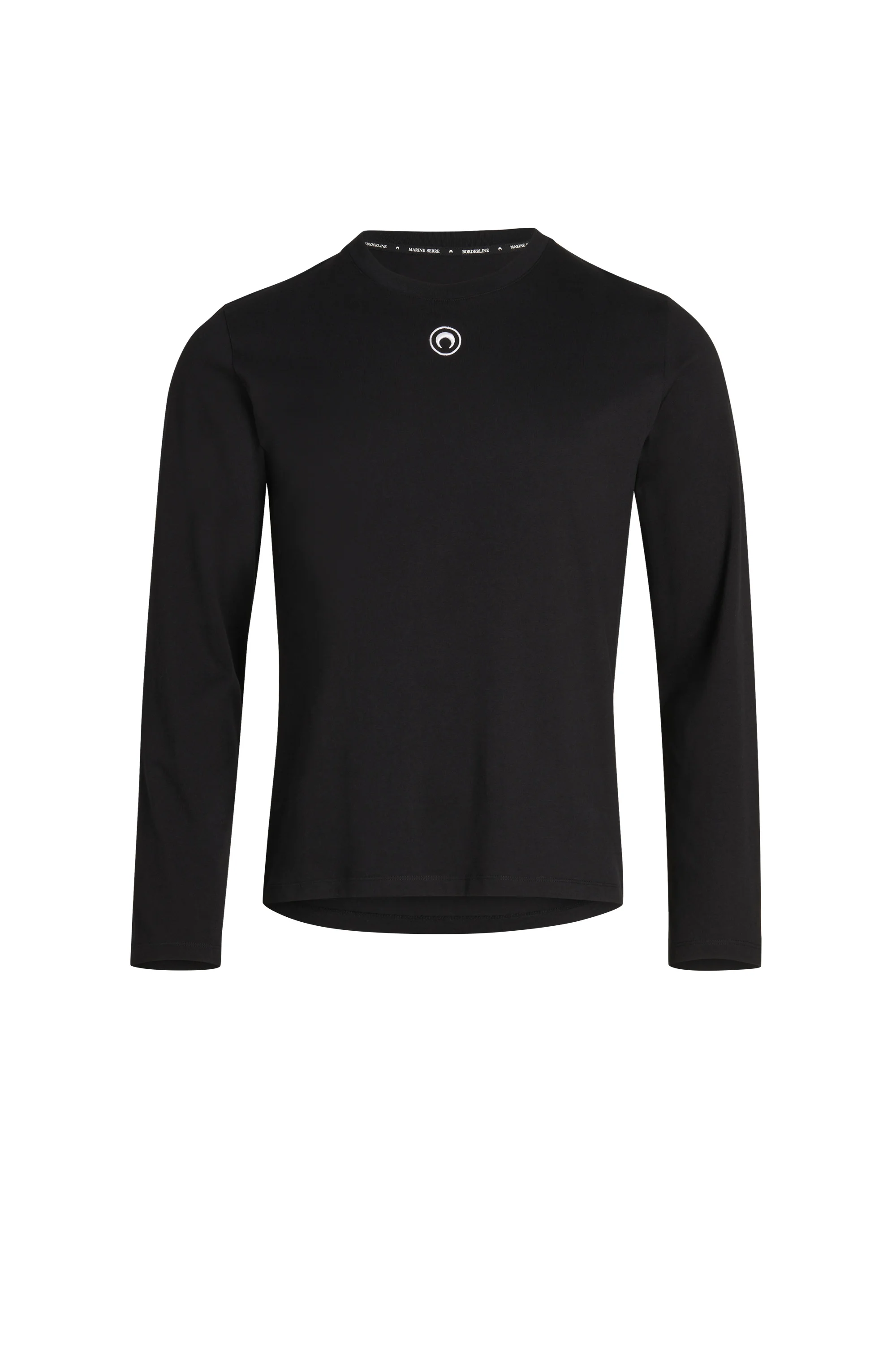 - Ribbed crewneck collar - MARINE SERRE bias around collar continuing on the shoulders - Cover stitched hem and cuffs - Contrasted white circle Moon logo embroidery placed below the front collar in center - MARINE SERRE Borderline label on the top back Materials Black Cotton 100% Cotton