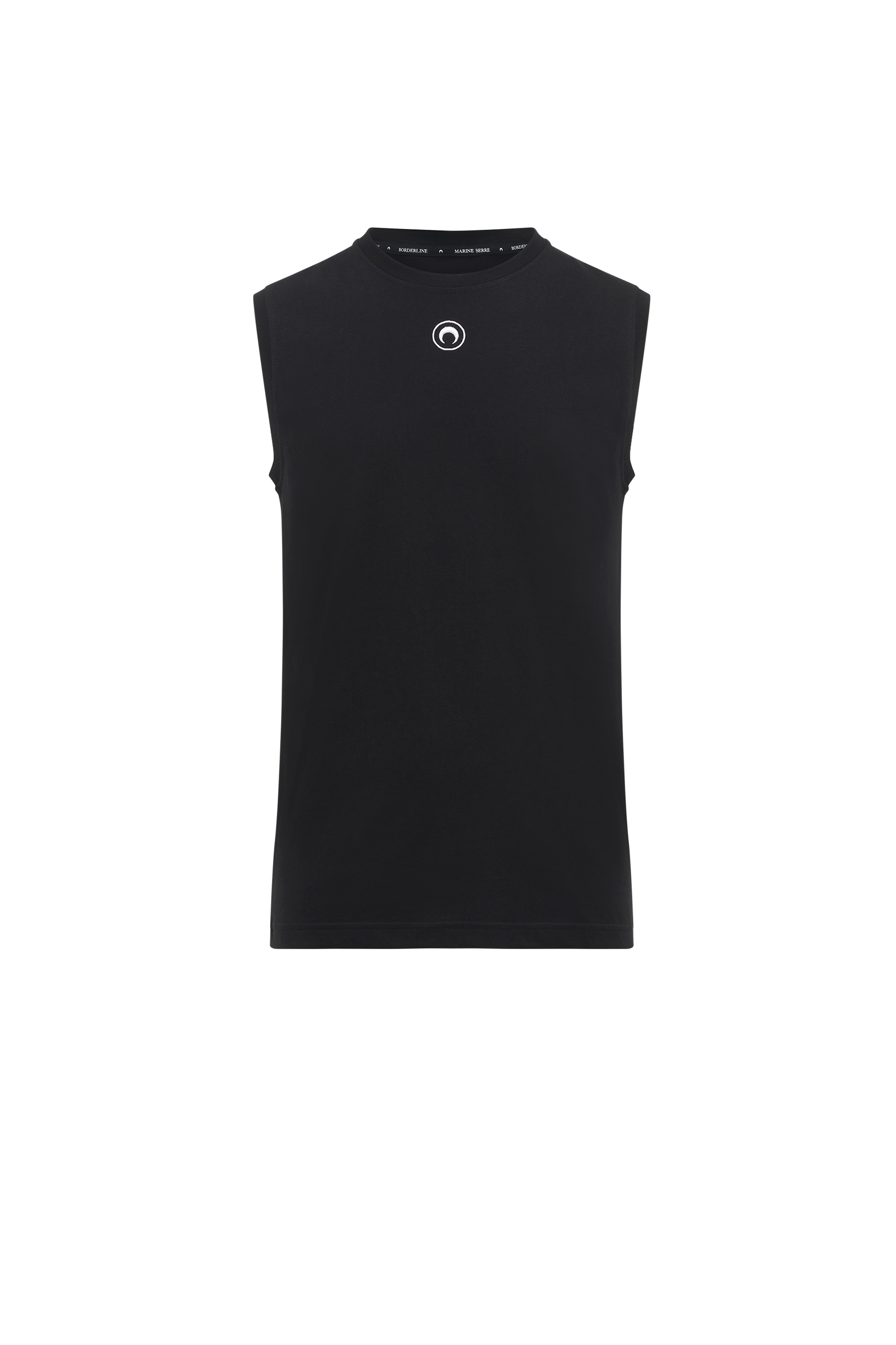 Ribbed crewneck collar and armholes MARINE SERRE tape around collar continuing on the shoulders Contrasted white circle moon logo emroidery below front collar in center MARINE SERRE Borderline label on the upper back below hood Coverstitched hem Materials Black Cotton 100% Cotton