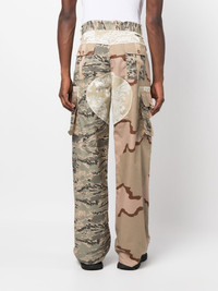 patchwork cargo trousers Highlights - Beige/military green - Recycled cotton - Camouflage pattern - Elasticated waistband - Front button and zip fastening - Belt loops - Classic five pockets - Two side cargo pockets - Straight leg - Patchwork design Imported Composition Recycled Cotton 100% SIZE & FIT Model measurements Height 6 ft 2 in(1.88 m) Bust/Chest 36.61 in(93 cm) Hips 35.82 in(91 cm) Waist 27.95 in(71 cm) Measurement FRONT RISE 14.56 in(37 cm) INSIDE LEG 33.46 in(85 cm) WAIST 32.28 in(82 cm) Outside Leg 46.45 in(118 cm) FittingInformation This piece fits true to size. We recommend you get your regular size Designed for a slim fit at the waist and loose over the leg Made with a mid-weight non-stretch fabric Washing instructions Machine Wash