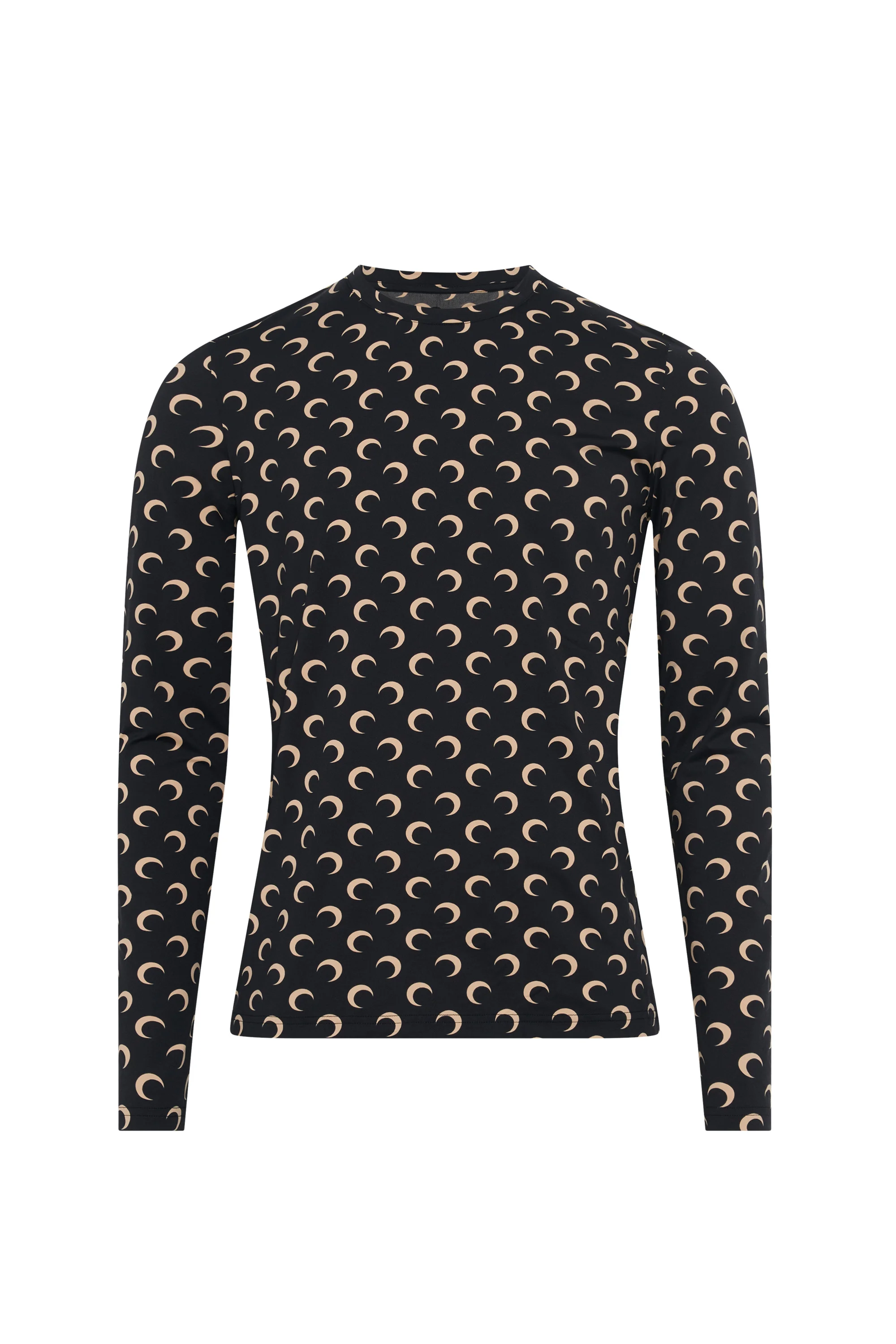 - Crewneck with self-fabric bias finish - Cover stitching along hem and cuffs Materials All Over Moon Jersey Black The All Over Moon print is the banner of the House, it represents the house’s virtues and vision of Futurewear, ever present since the very beginning of the House for RADICAL CALL FOR LOVE. Indeed, what is perhaps the House’s most popular line holds its values at heart with a jersey composed entirely of recycled material. 88% Recycled Polyamide (GRS Certified), 12% Recycled Elastane