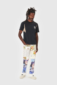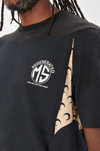 Ribbed neckline Tan All Over Moon cutout on the side of the garment MARINE SERRE Regenerated Label on front left chest Materials Regenerated Tee-Shirt Black The upcycled graphic T-shirts embody an intergenerational, genderless, and symbolic style. These one-of-a-kind pieces reflect Marine Serre's DNA, exuding a casual and ironic attitude for a timeless look. 100% Cotton, 88% Polyamide recyclé, 12% Élasthanne recyclé