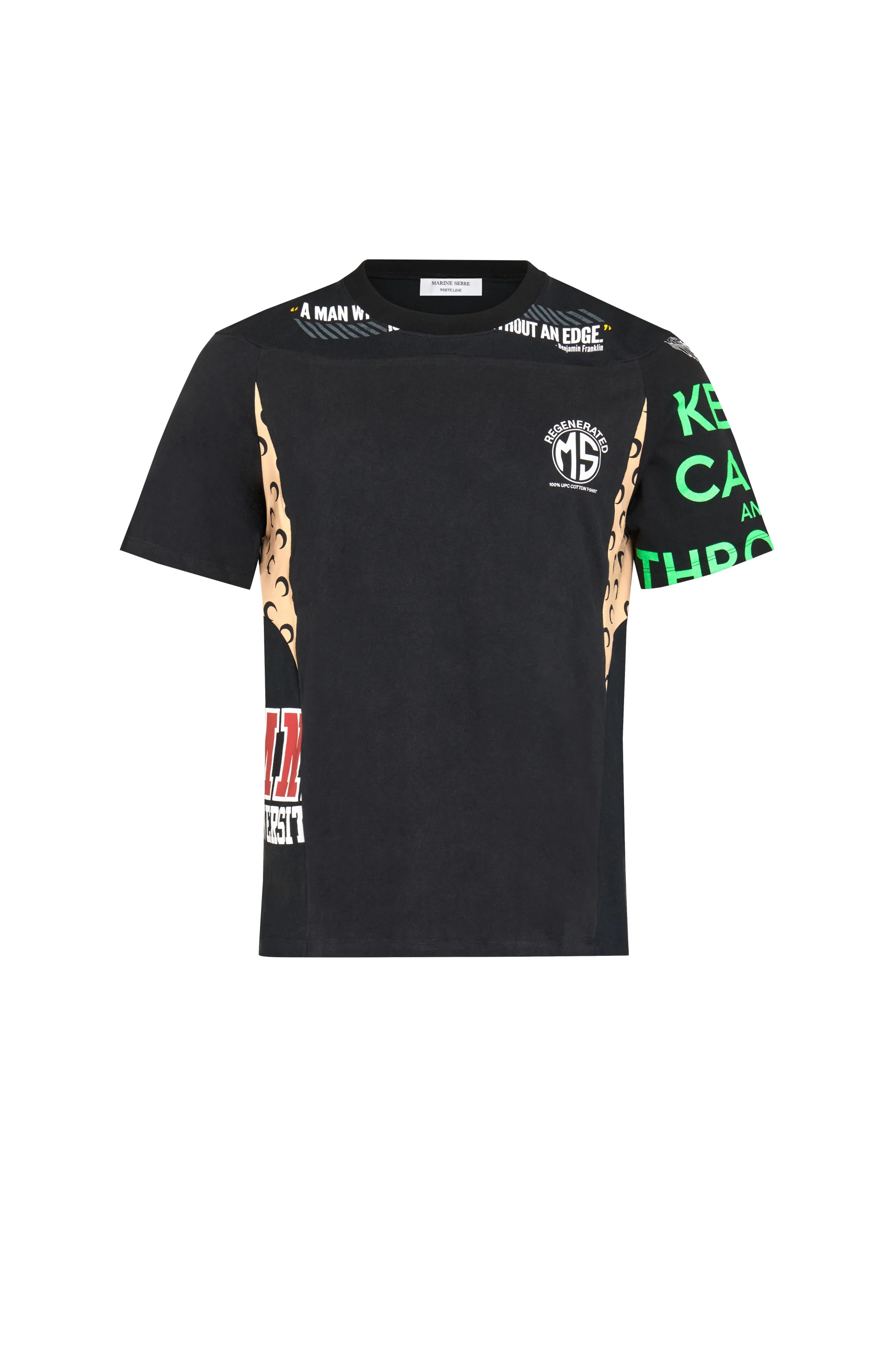 This T-shirt, made of 100% cotton, features a patchwork design with signature All Over Moon print inserts in jersey fabric. The regenerated broken white logo on the chest adds a distinctive touch. Materials Graphic T-Shirt Black T-shirts with graphics and logos: intergenerational, genderless, symbolic, they always convey a direct message, be it about sports, idols, concerts or political messages. Matter: Graphic T-shirts 100% Cotton, ca. 2010, sourced in Netherlands