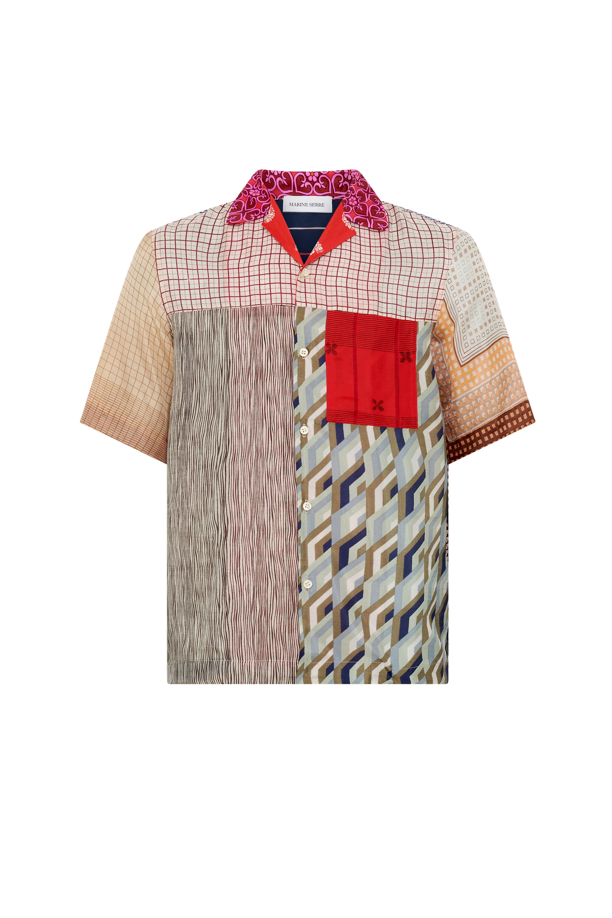 - Collar finished with double topstitching - Buttoned front - Applied pocket on left breast - Back yoke - Pin hem - Upcycled silk scarves patchwork construction - Branded label woven at hem Materials Regenerated Silk Scarves Regenerated from upcycled silk scarves, this fabric celebrates the beauty of vibrant prints, making it the brand's preferred light material. A selection of upcycled print silk scarves in countless shades is combined and merged to create ethereal designs that seamlessly blend into natural landscapes. 100% Silk