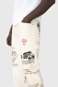 Unisex relaxed fit medium-waisted carpenter pants. Product Detail - Five square pockets with hammer loop - Shank button closure - Belt loops - Double layered hem - Upcycled totebags panelled construction - MS artworks printed on front and rear pockets Composition and Traceability Product details page relating to environmental qualities or characteristics UPA059A UWOV0009 WH30 ECRU Composition: BASE MATERIAL: 100% COTTON - SECONDARY FABRIC: 100% COTTON - LINING: 100% COTTON Traceability: Sourcing and upcycling country : France Manufacturing: France