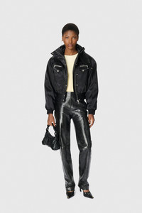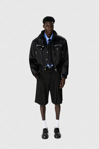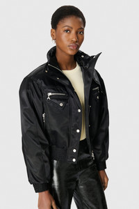 Boxy fit short-length bomber jacket with high neck and long sleeves Product Detail - Chin strap fixed with snap buttons - Invisible front zipper - Visible snap buttons - Two zipped pockets on chest and side with moon puller - Raglan shoulders with shoulder pads - Elasticated hem and cuffs with stitching details - Fully lined with nside pockets - Marine serre leather patch Composition and Traceability Product details page relating to environmental qualities or characteristics UJA068A_CWOV0068_BK99_BLACK Composition: Main Fabric: 40% Polyester , 30% Polyamide - Recycled , 22% Polyamide , 8% Polyurethane - Lining: 100% Viscose Product Care: Do not machine wash Do not bleach Low temperature iron on reverse side Dry clean with precaution Do not tumble dry Traceability: Weaving, Dyeing, Manufacturing: Italy