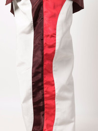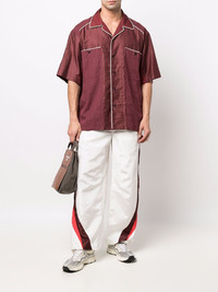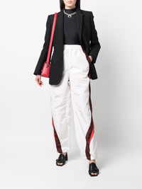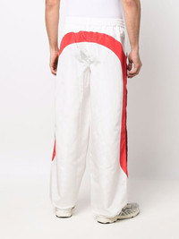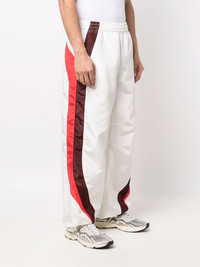 side-stripe track pants Marine Serre's trousers offer a street-style-inspired silhouette. Contrasting stripes trim the relaxed leg for a bold finish. Highlights - White/red/burgundy - Recycled polyester - Side stripe detailing - Elasticated waistband - Straight leg - Two side slit pockets Imported Composition Outer: Recycled Polyester 100% Lining: Viscose 58%, Cupro 42% SIZE & FIT Model measurements Height 5 ft 10 in(1.78 m) Bust/Chest 31.49 in(80 cm) Hips 36.22 in(92 cm) Waist 25.59 in(65 cm) FittingInformation This piece fits true to size. We recommend you get your regular size Designed for a slim fit at the waist and loose over the leg Made with a mid-weight non-stretch fabric Washing instructions Dry Clean Only