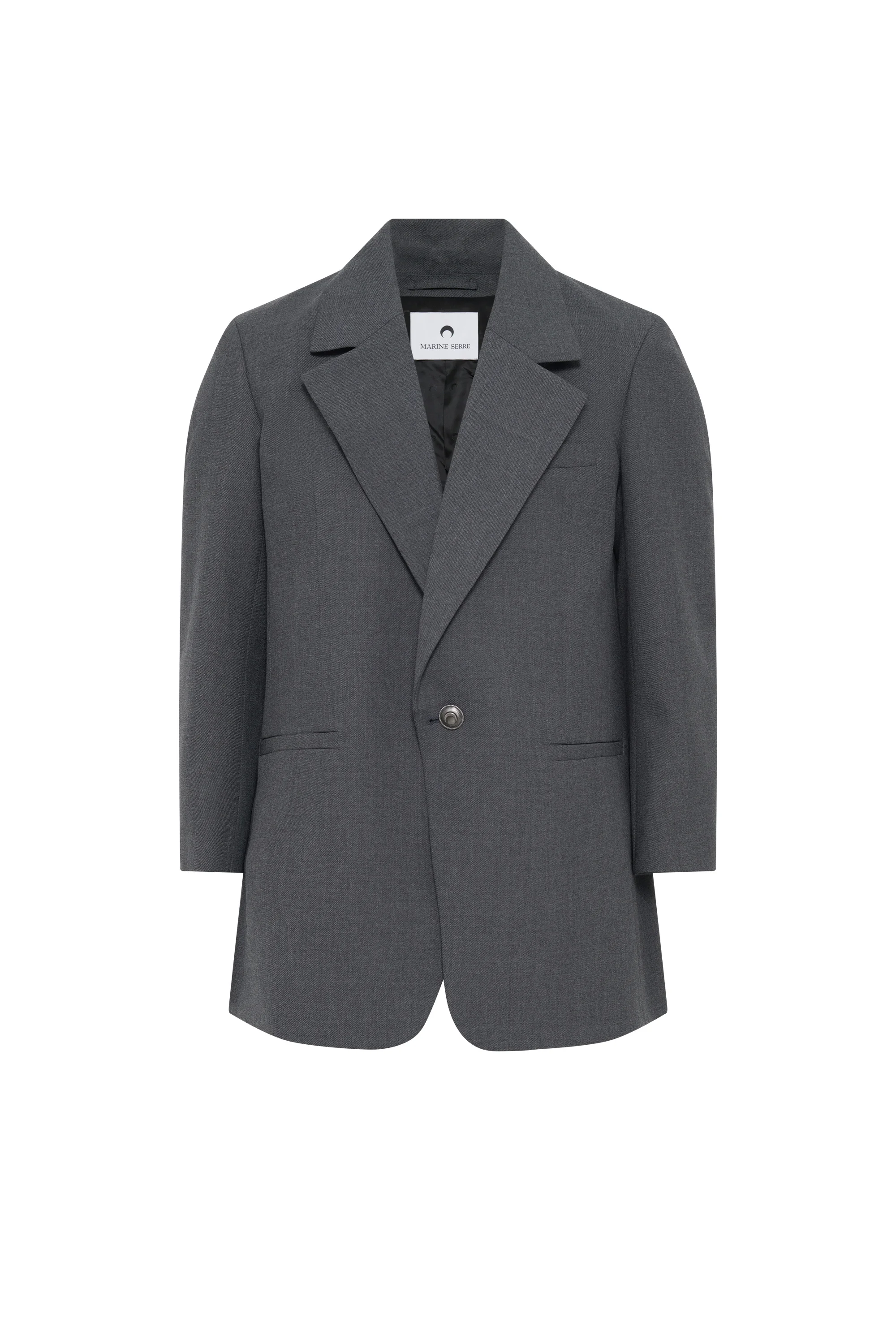 - Single button front closure - Enameled signature Moon button - One chest pocket and two side flap pockets - Interior pockets - Shoulder pads - Rear vent - Signature Moon jacquard lining - MS Tailor label single stitched on back yoke Materials Regenerated Tailoring New for this season, Moon Checks Jacquard is an RWS-certified wool jacquard that is woven in Italy and features a fusion of the Marine Serre Moon and a check pattern in neutral earth tones. Italian tailoring has strongly permeated the new collection, which has been constructed as an ode to the country’s savoir-faire. After conducting extensive research into potential new tailoring materials — always with the challenge of sourcing dormant fabrics suitable for generation — we settled upon rolls of red and grey fabric, the basis of the Regenerated Tailoring range. For men, a fitted double-breasted jacket designed for formal occasions is joined by an elongated jacket with exaggerated shoulders that’s versatile enough to appeal to women too. Women’s garments include a coat and jacket whose discreet shoulders, simple button closure and generously open neckline recall the Moon Airbrushed leather suit jacket. Sensual, lighter pieces include a strapless dress cinched above the bust by a removeable leather belt, and a pleated mini skirt. Pair it with one of the collection’s knits for a collegiate look. Main fabric: 55% Polyester, 42% Wool, 3% Elastane - Lining: 100% Viscose