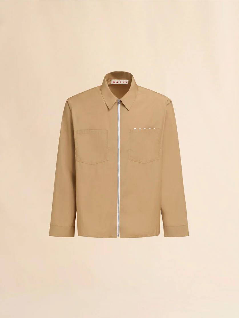 BEIGE ORGANIC POPLIN ZIP SHIRT WITH HIDDEN LOGO