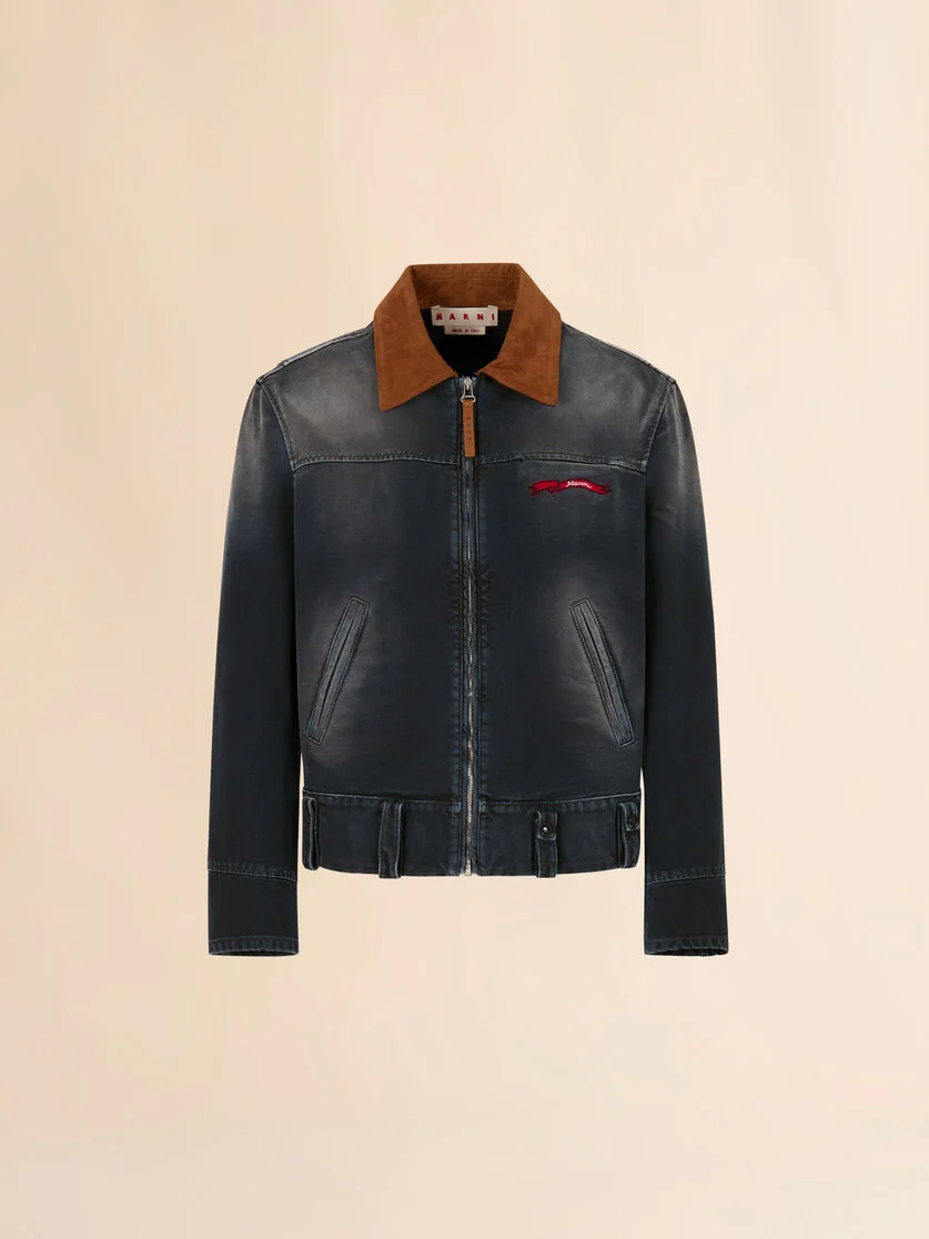 Jacket made from compact cotton canvas with a contrast faux suede collar. Garment-dyed for a faded finish. Regular fit with hidden zipper closure and welt pockets. Detailed with workwear-style belt loops at the hem. Marni flag logo patch on the chest. Made in Italy MODEL JUMU0205GXUSCY6300N99