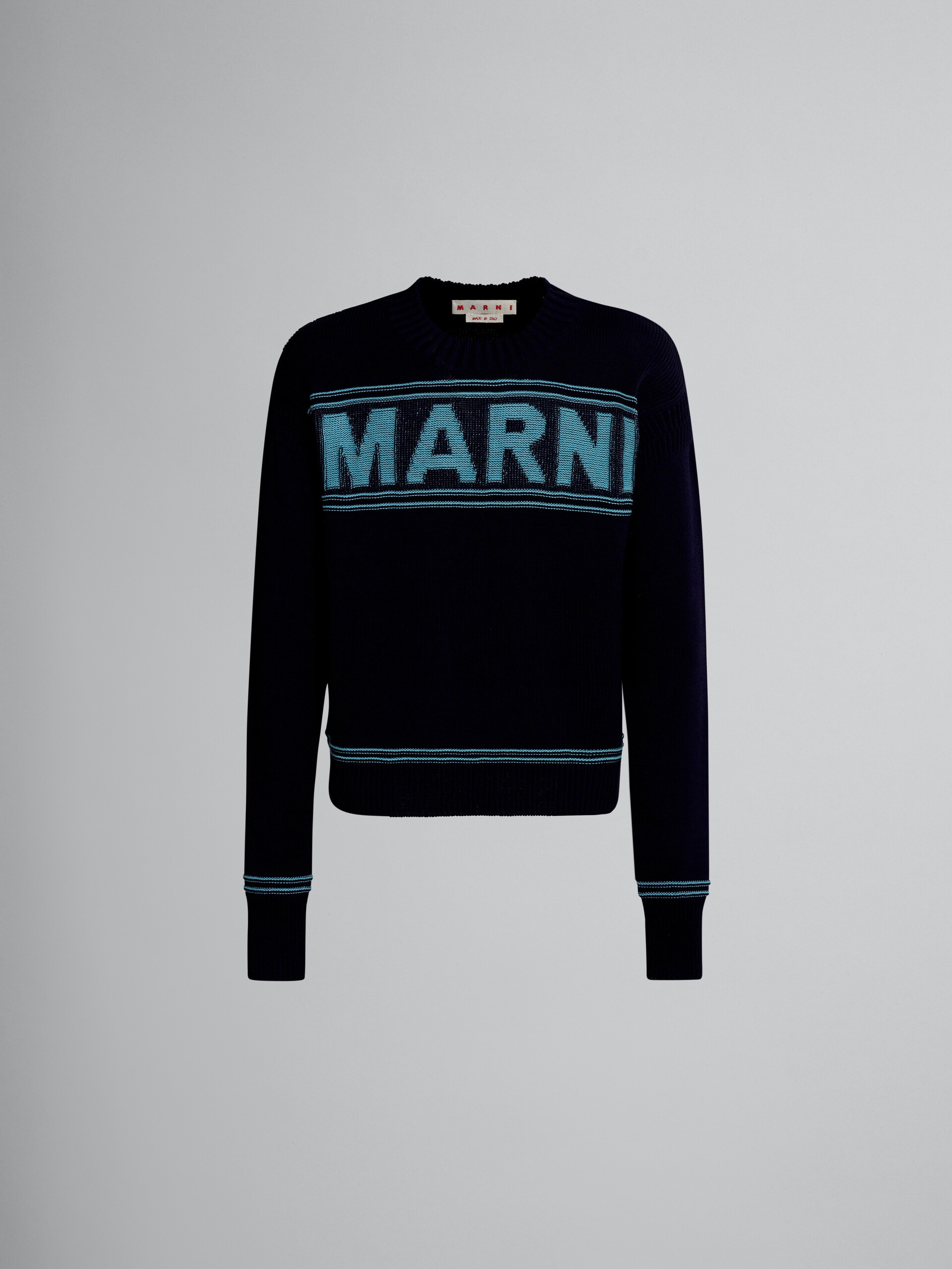 Long sleeve crewneck sweater. Marni logo and stripe inlays in contrasting colour. Ribbed trims. DETAILS FIT The model is 185 cm tall. The model is wearing size 48 IT. COMPOSITION Primary Fabric: 100% Cotton Knit