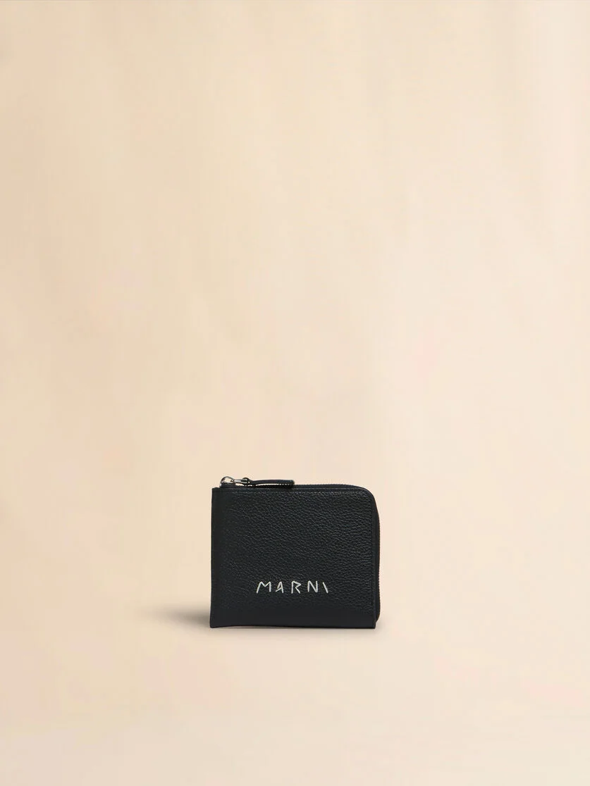 Wallet made from milled calfskin leather. Hand-stitched Marni Mending logo on the front. L-shaped zip-around closure. Made in Italy MODEL PFMI0095Q0P653300N99 COMPOSITION Body: 100% Calf Leather - Contrast: 100% Ovine Leather - Contrast: 100% Polyester - Lining: 100% Ovine Leather - Metallic Parts: 100% Brass - Metallic Parts: 100% Zama